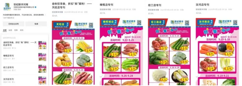 世纪联华河南微信公众号的内容更新依旧停留在2025年9月22日,当天发布的“金秋狂享曲,折扣‘购’犀利”促销内容,包括“天旺店专刊”“橄榄店专刊”“经三店专刊”和“汝河店专刊”。