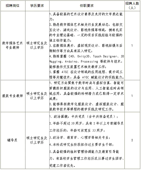 学校设置美术学、设计学2个一级学科,涵盖10个本科专业,其中有绘画、雕塑、书法学、中国画4个美术学类专业,有视觉传达设计、环境设计、服装与服饰设计、产品设计、数字媒体艺术、工艺美术6个设计学类专业。根据我校发展需要,现面向社会公开招聘,具体要求如下: