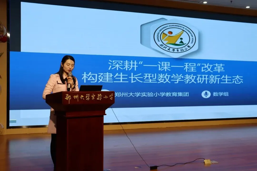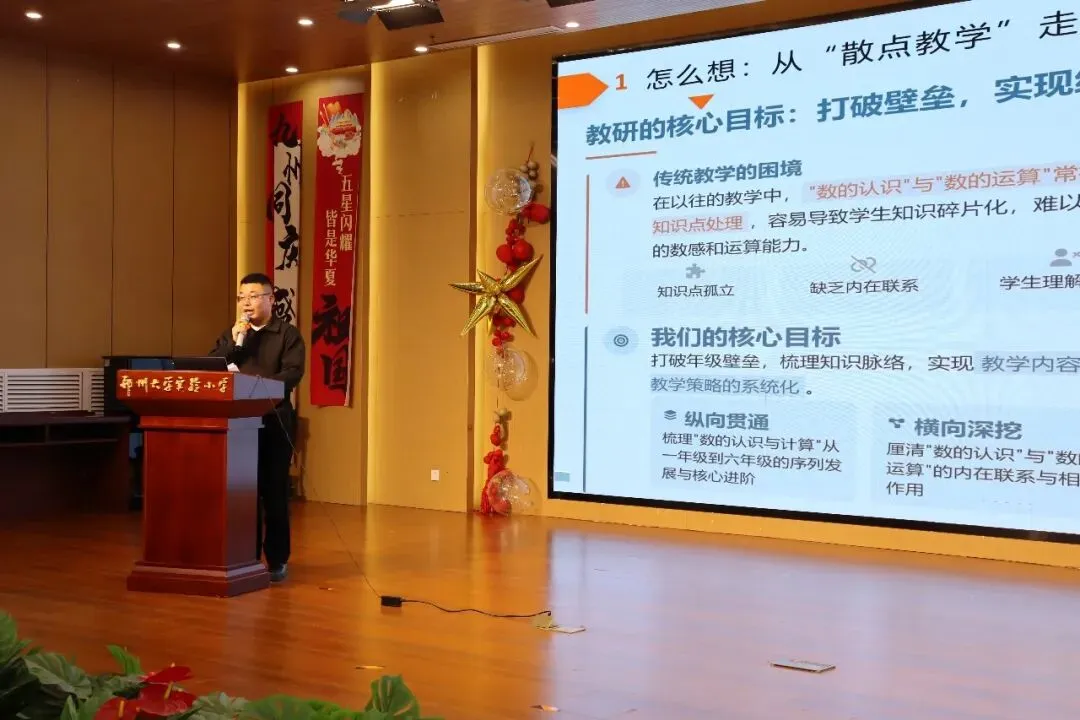 在经验分享环节,三位教师代表带来了干货满满的实践成果。外国语小学的刘娟老师聚焦“学科课程实施方案和课程纲要的撰写”,从背景依据、课程目标、内容实施、评价保障等方面,系统讲解了撰写的核心要点与实操方法,强调要立足课标、贴合学情,实现国家课程的校本化落地;郑州大学实验小学的张见华老师以“指向教师素养发展的教研组建设”为主题,分享了该校“一课一程”改革实践,详细介绍了“乐学、善教、慧研”的教研文化构建,以及社会化小组合作学习、“导 — 思 — 议 — 展 — 评 — 用”六环节课堂模式等创新举措;创新大道小学的李少平老师则围绕“数的认识与运算”主题教研,展示了该校从“散点教学”走向“体系建构”的探索历程,通过“主题式卷入教研”与课例研究,形成了贯通 1-6 年级的结构化授课模式,为与会教师提供了可复制、可推广的实践样本。