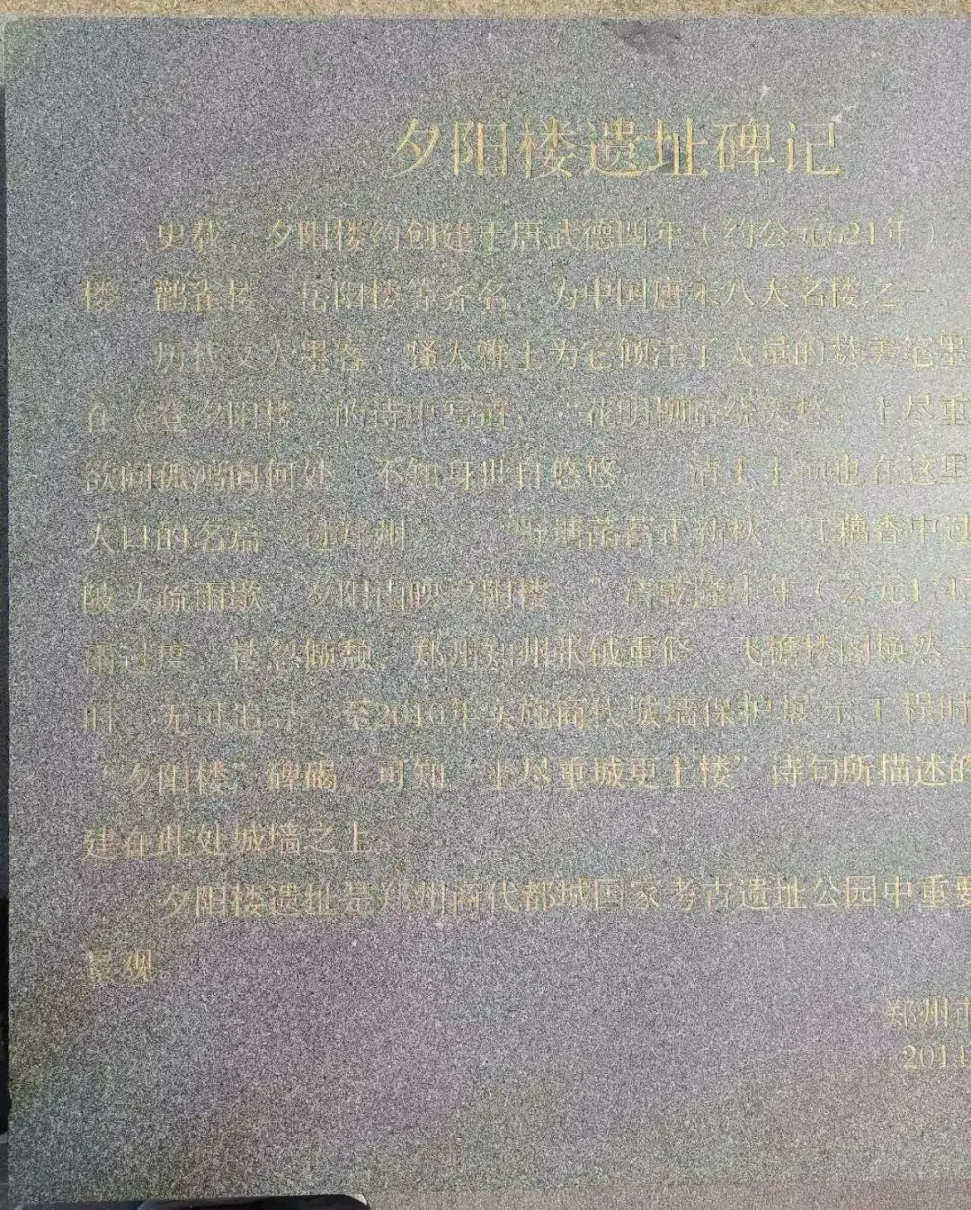 2014年,郑州市政府在商城遗址西南城角设立《夕阳楼遗址碑记》,确认李商隐“上尽重城更上楼”诗句所描绘的夕阳楼,应建在此处城墙之上。至此,夕阳楼旧址的谜底似乎已经揭晓——不是大学路上的古玩城,而是南学街旁的城墙角。