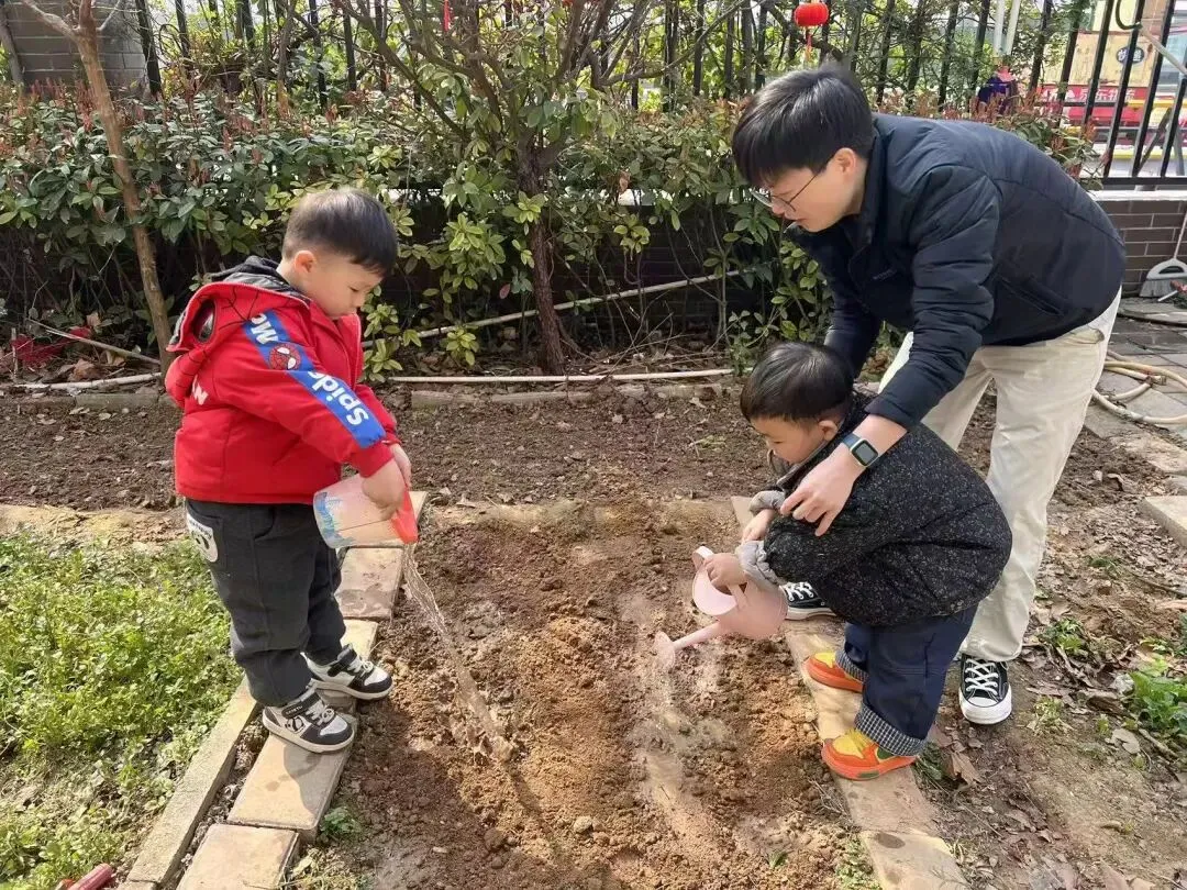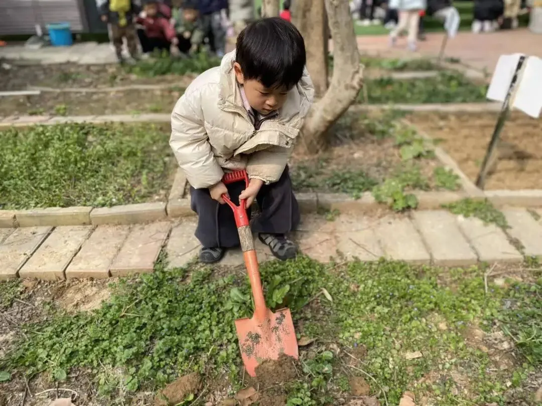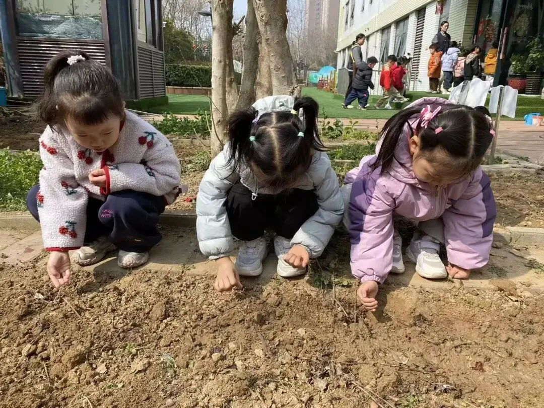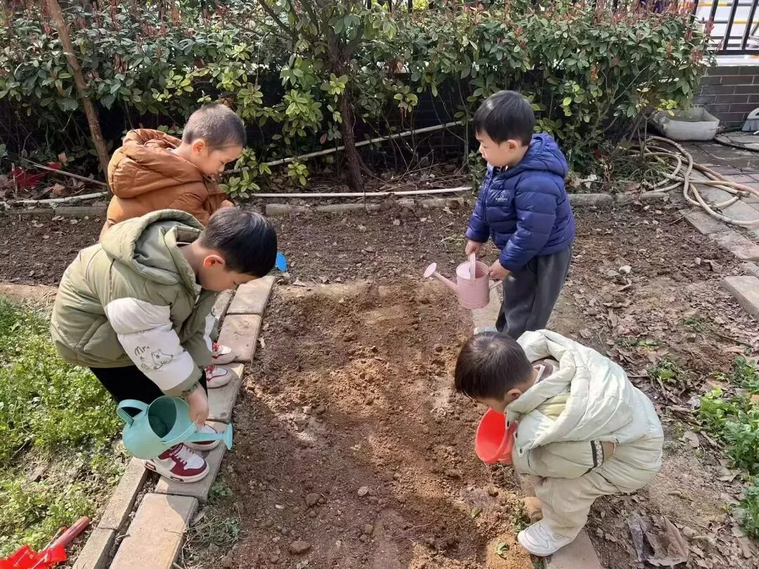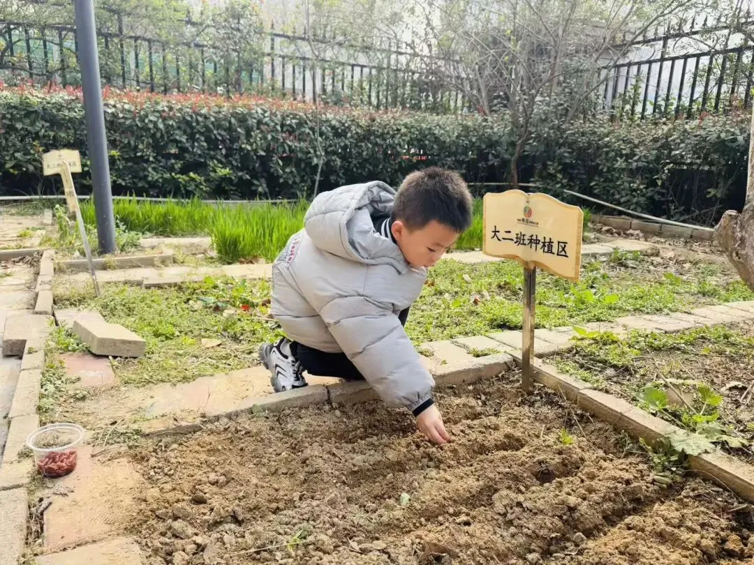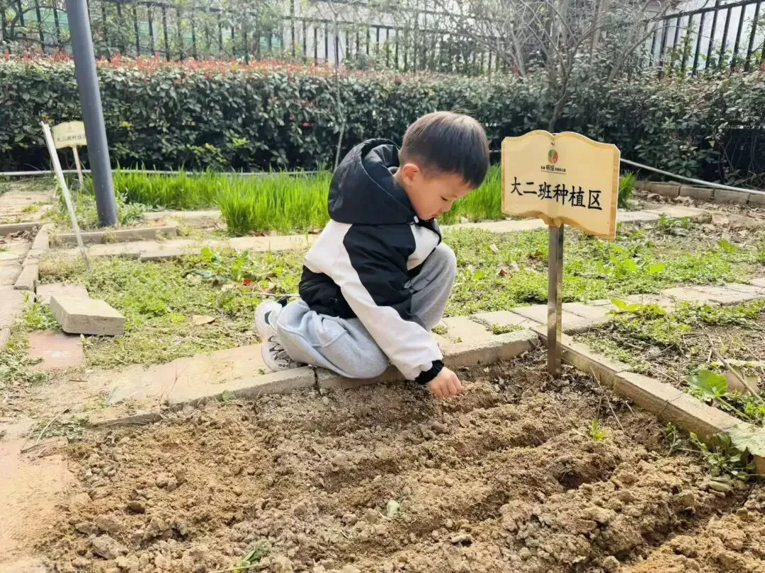宝贝们用小小的手,在种植区里轻轻播下希望的种子。松土、挖坑、放种、覆土、浇水,每一步都认真又专注。
