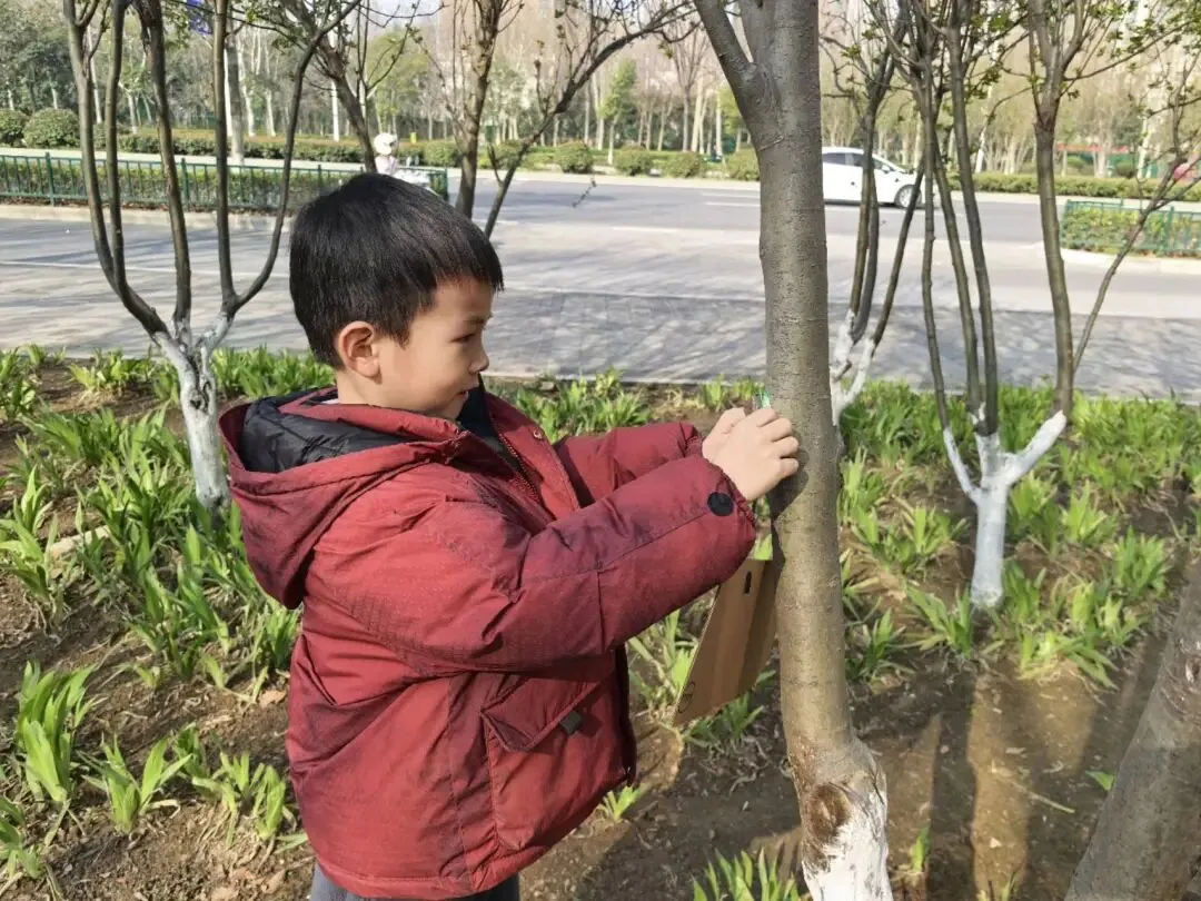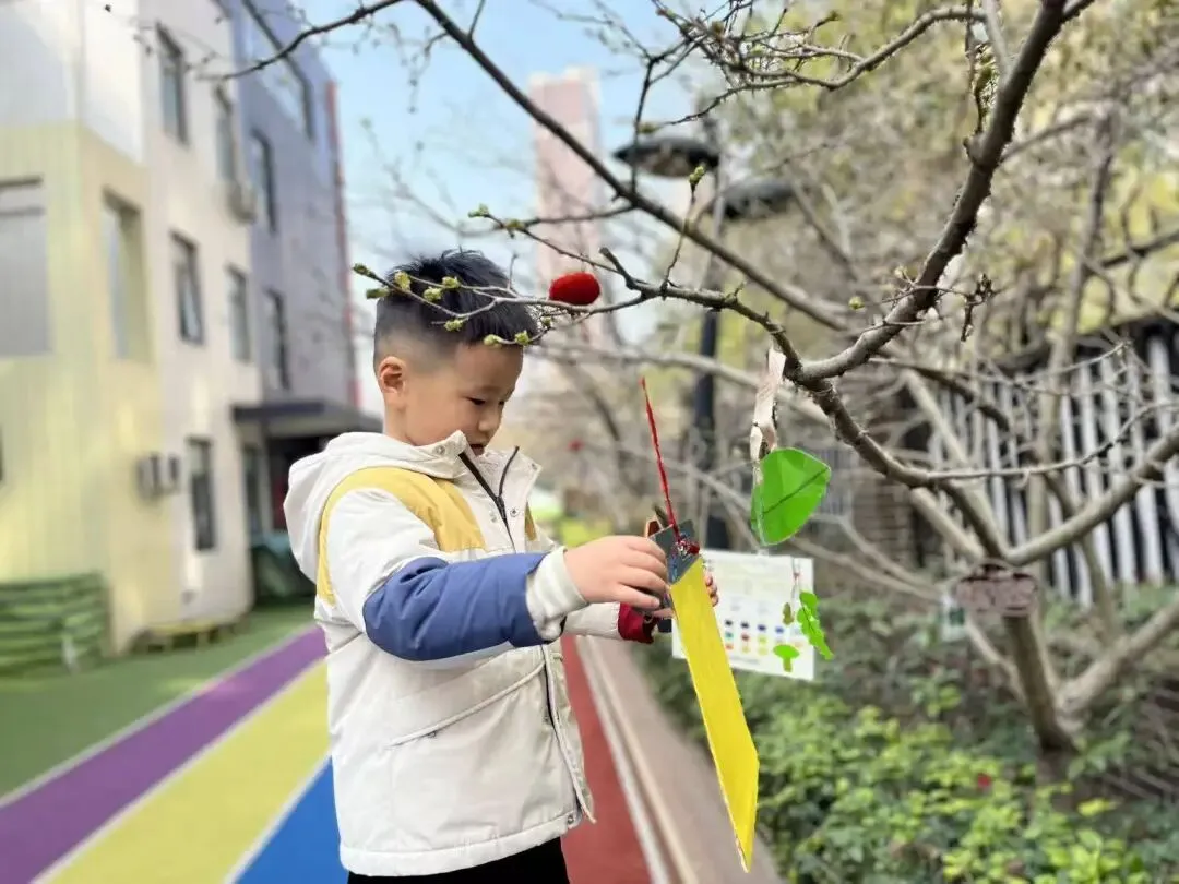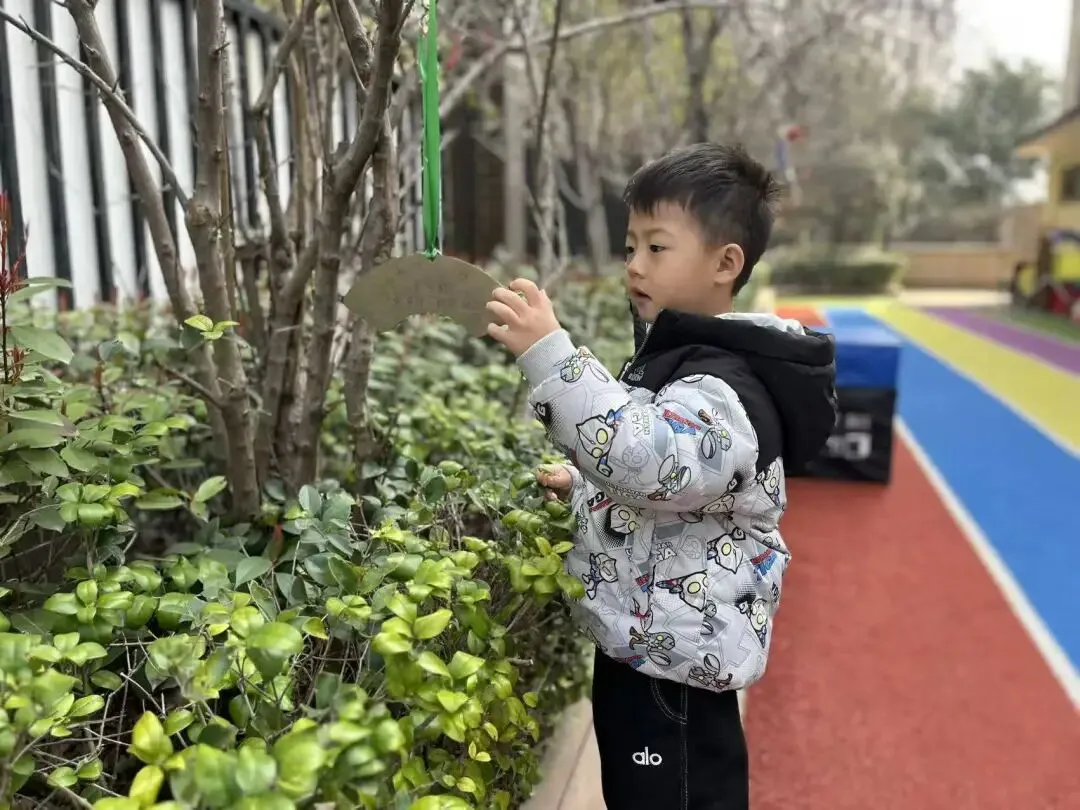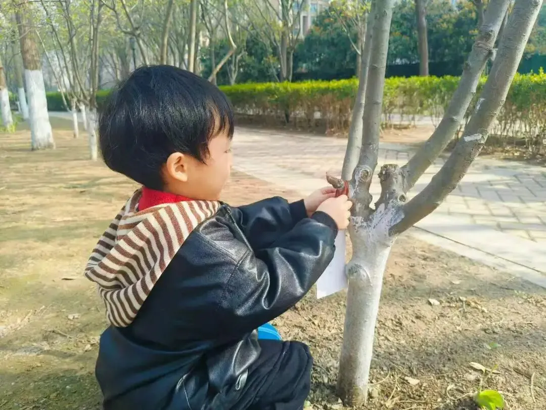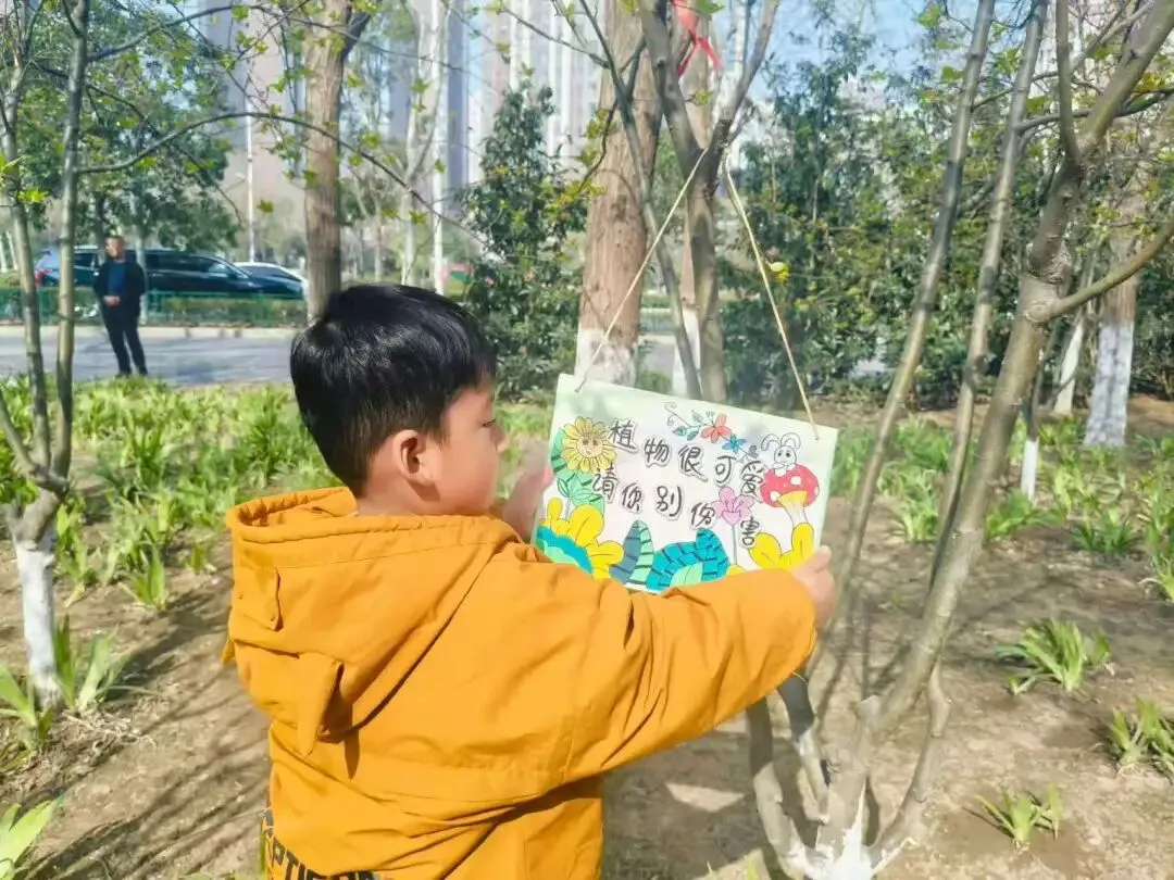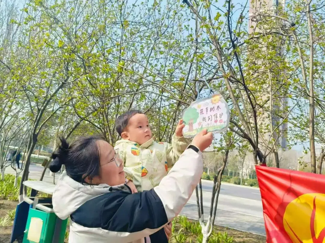 中班的小朋友们走出园区,奔赴户外开展浇水与挂植树牌活动。孩子们亲手为小树浇灌生命之水,还挂上精心制作的植树牌,一笔一画写下对小树的祝福与期盼。亲手触摸、亲身参与,让孩子们真切感受到植树护绿的意义,学会尊重生命、守护自然。