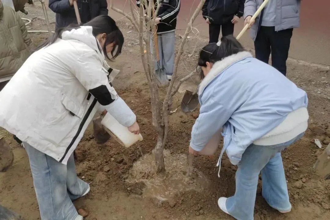 活动现场,师生们热情满格、分工协作,一场与春天的植绿之约温馨启幕。挥锹挖洞,为树苗打造整齐“新家”;小心移苗,扶正夯实让根系贴合土壤;慢水浇灌,以甘泉滋养新苗生机,每一个动作都饱含对绿色的珍视。