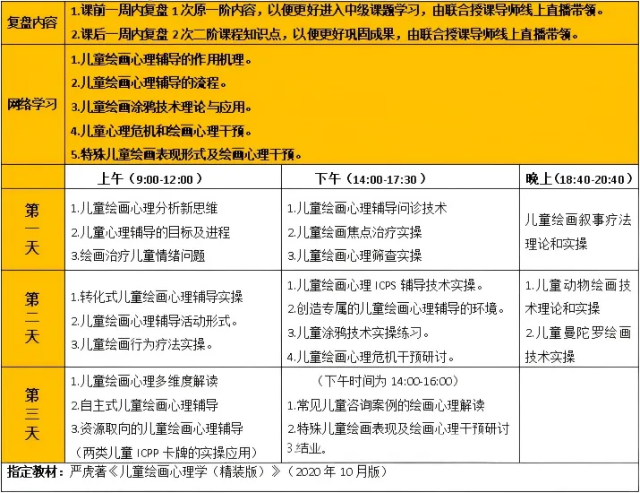 1.自2022年3月份,严虎博士本人不再讲授线下的“儿童绘画心理一阶段课程”,均授权给团队授权导师讲授,全国各地均有排课,详看相关宣传。