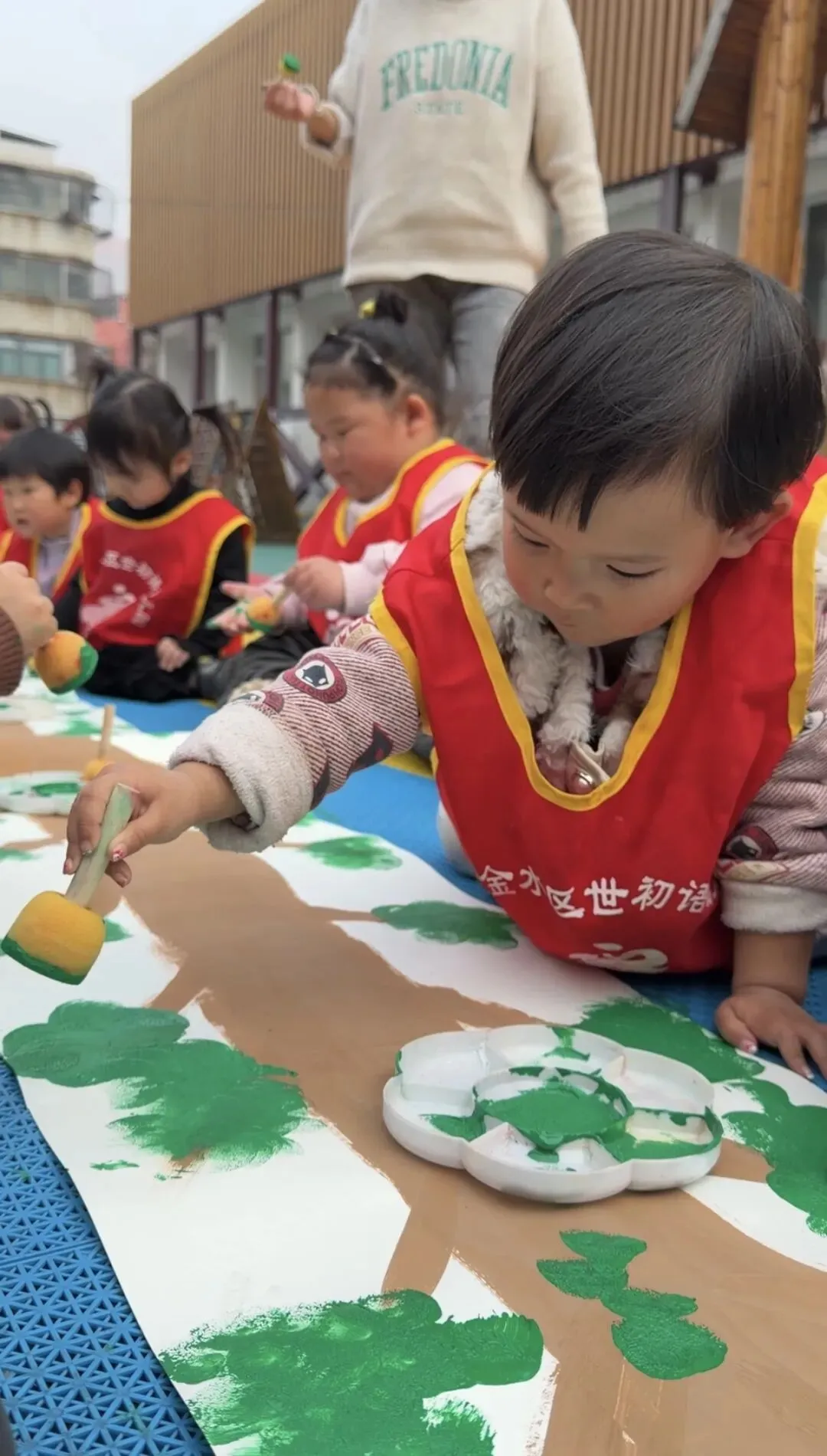 小班的教室,变成了创意满满的绘画天地。孩子们拿起水彩,在画纸上尽情挥洒灵感,用手掌绘上色彩描绘心中的植树节。