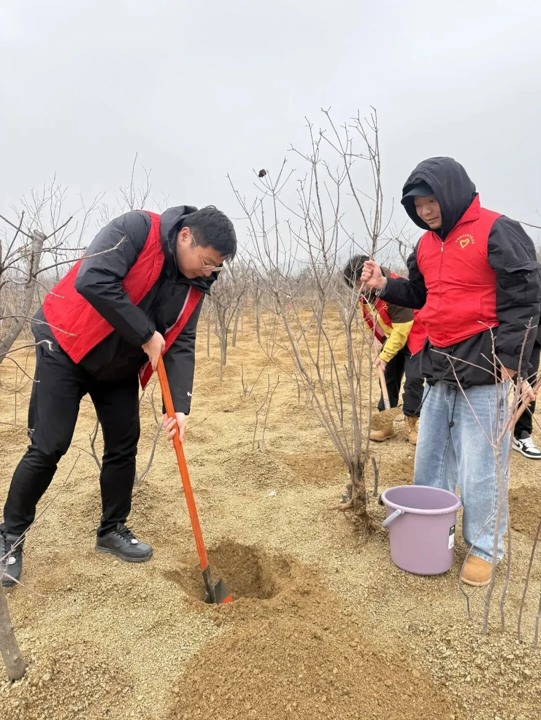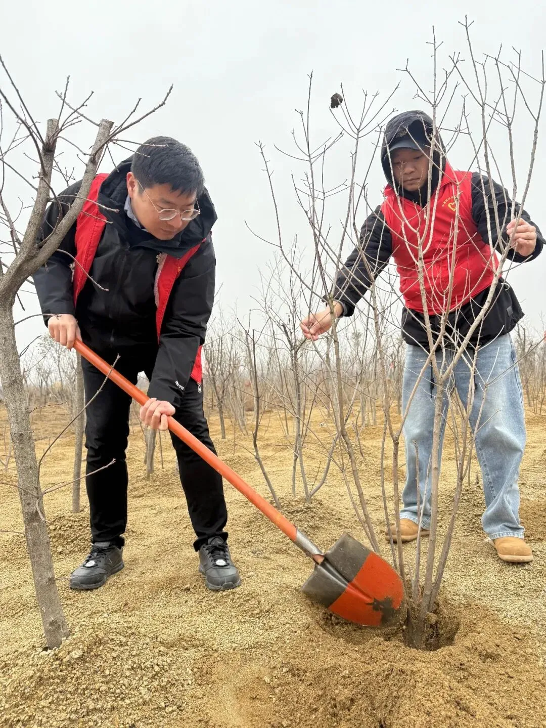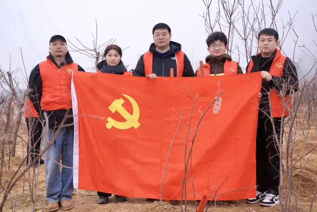 活动现场,大家迅速分组投入劳动,严格按照技术规范,认真完成挖坑、扶苗、填土、浇水、夯实等每一道工序,用汗水浇灌绿色希望。党员们佩戴党徽、亮明身份,分工协作、配合默契,以实干展现先锋本色。经过近两小时的共同努力,一株株新栽苗木迎风挺立,为初春的大地增添了勃勃生机。