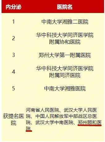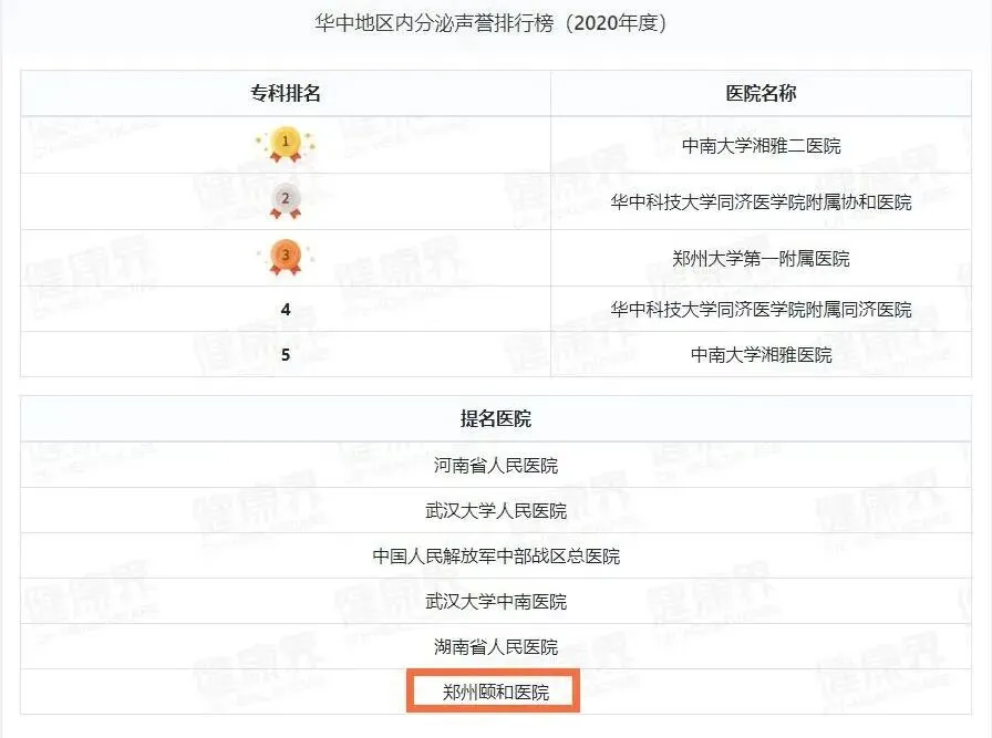 郑州颐和医院内分泌科第三次荣登“华中地区内分泌声誉排行榜”!