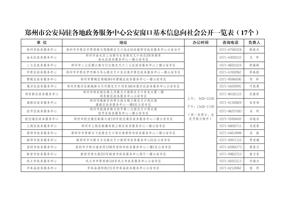 郑州市公安局驻各地政务服务中心公安窗口基本信息向社会公开一览表