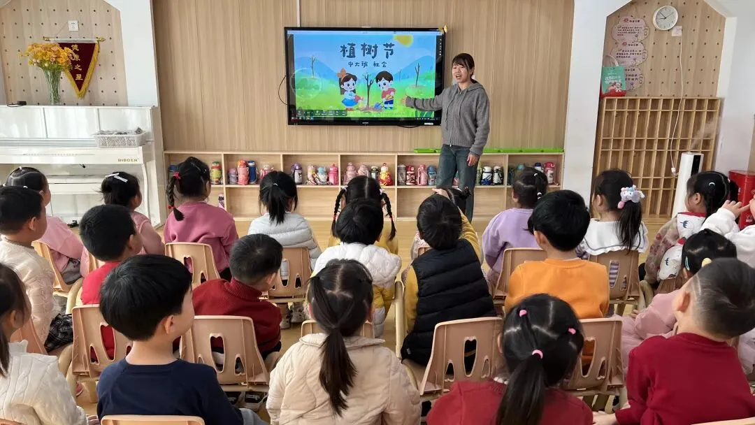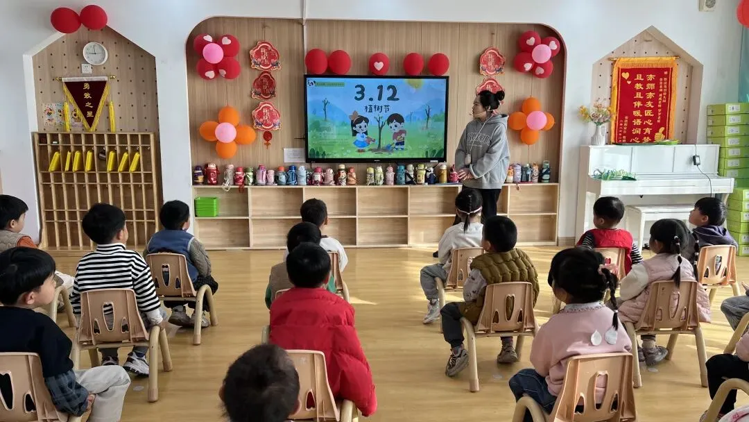 “为什么要种树?树能给我们带来什么?”晨谈时光里,老师们用生动的绘本、趣味的动画,为孩子们揭开植树节的神秘面纱。从植树节的由来,到树木净化空气、遮风挡雨的作用,从常见的果树品种,到种子发芽的小秘密,一双双眼睛里满是好奇,一个个问题里藏着对自然的向往。