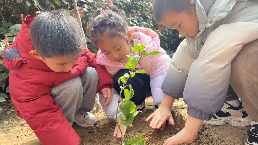 孩子们捧着可爱的盆栽,将种子放在小盆中覆盖薄土,小心翼翼地完成每一个动作,在泥土芬芳中感知生命的奇妙,期待着嫩芽破土而出的瞬间;孩子们合作栽种小果树,填土、浇水,记录下种植的每一步。