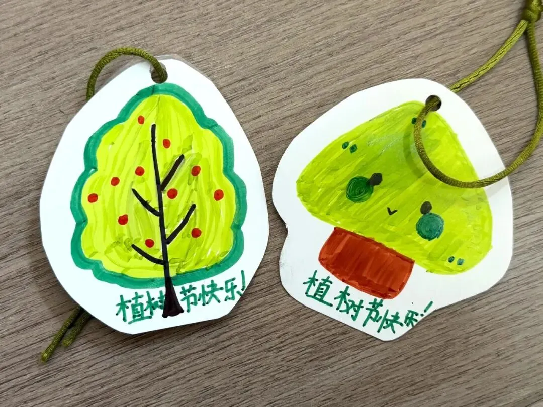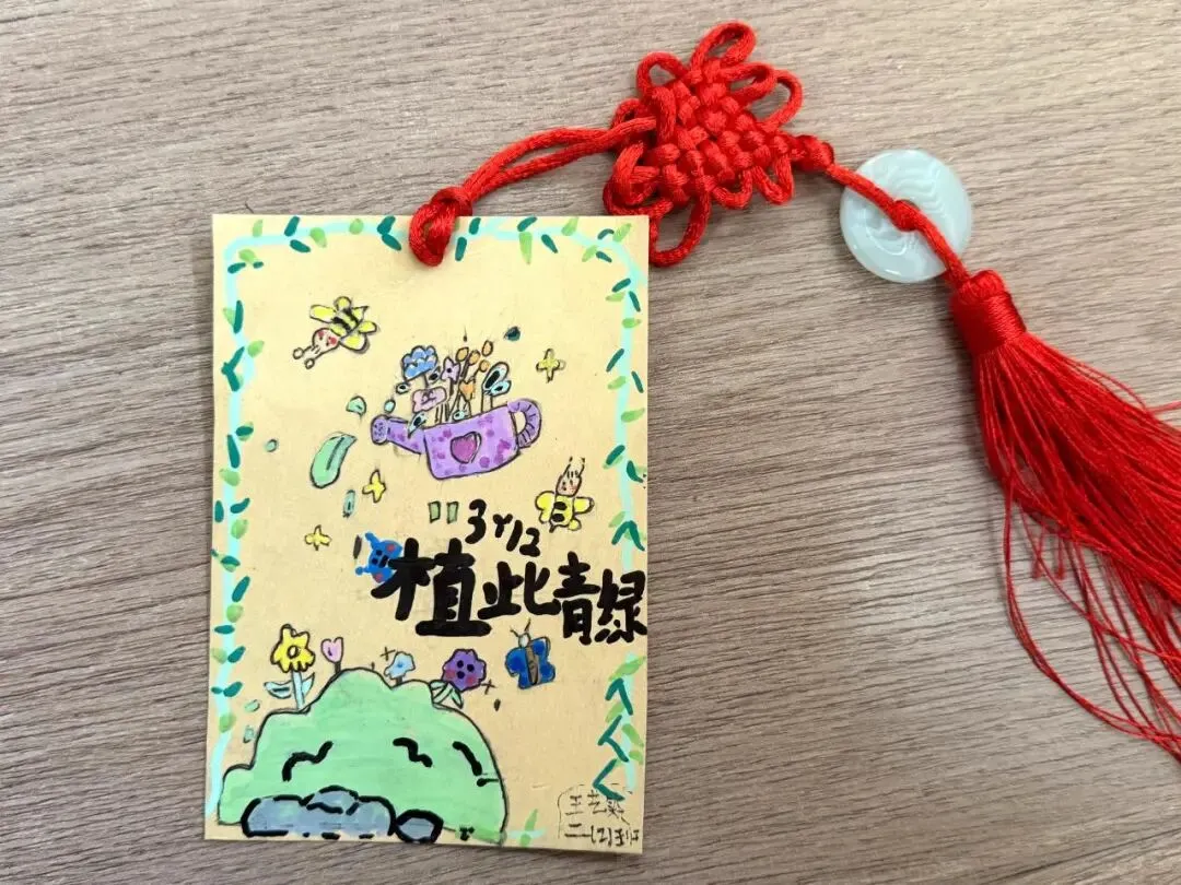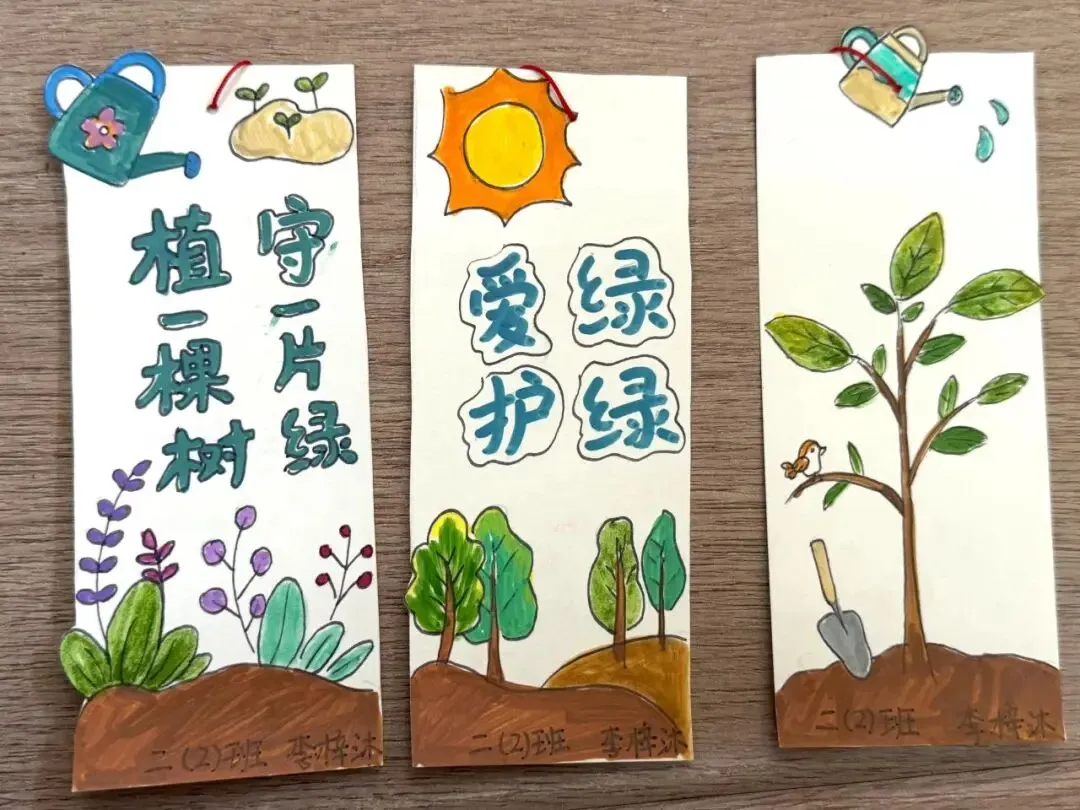种一棵树,等一场春天。愿我们都能像树一样,扎根土地,向阳而生,在同学们还充分发挥想象力和动手能力,利用卡纸、废旧材料等制作了形态各异、色彩缤纷的植树节主题书签。有的绘上新芽吐绿,有的剪出小鸟归林,还有的用绳结穿起祝福。小小书签,既是对绿色家园的向往,也是“变废为宝”理念的生动实践。岁月的长河中,留下属于自己的绿色印记。