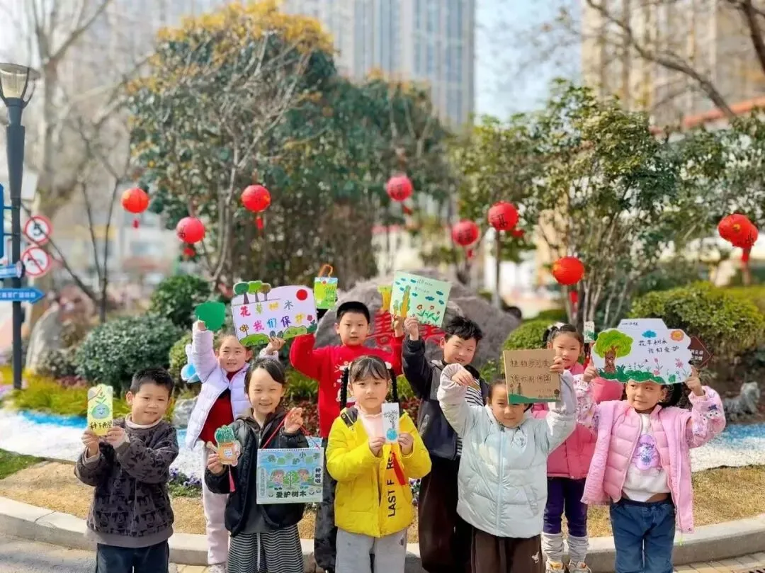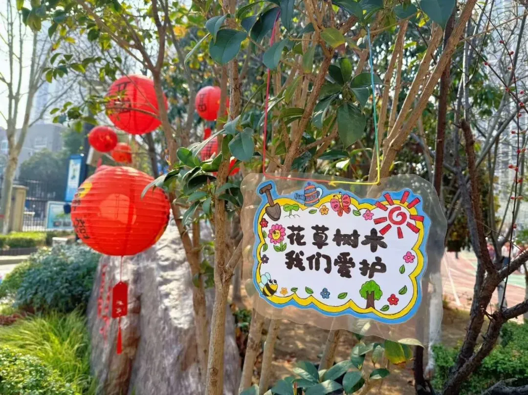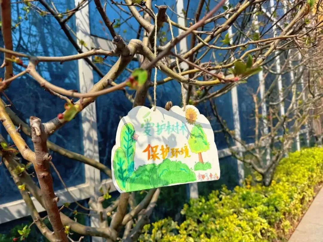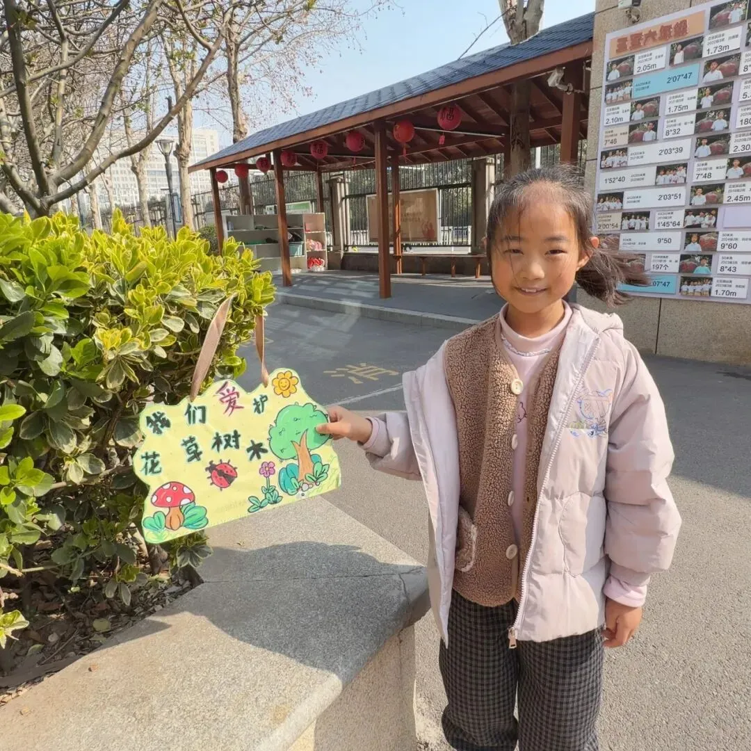 在“挂牌护绿”环节中,同学们化身“绿色小设计师”,利用防水卡片和小木板精心制作爱护花草标语牌。“小草微微笑,请你绕一绕”“我和小树共成长”“爱护花草,从我做起”……一句句稚嫩却真挚的话语,搭配色彩明快的图画,既传递出孩子们对自然的珍视,也成为校园里一道文明有爱的风景线。优秀标牌被悬挂在校园的花草树木旁,装点出别样的春日童趣。