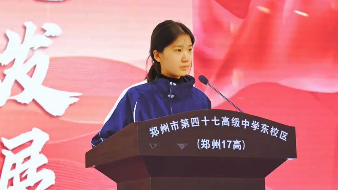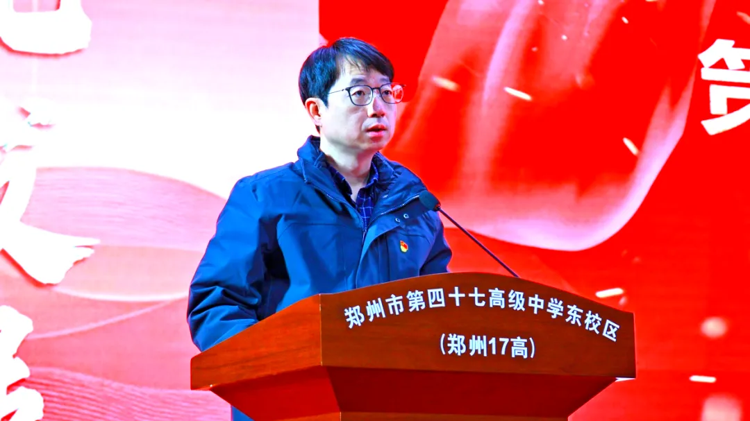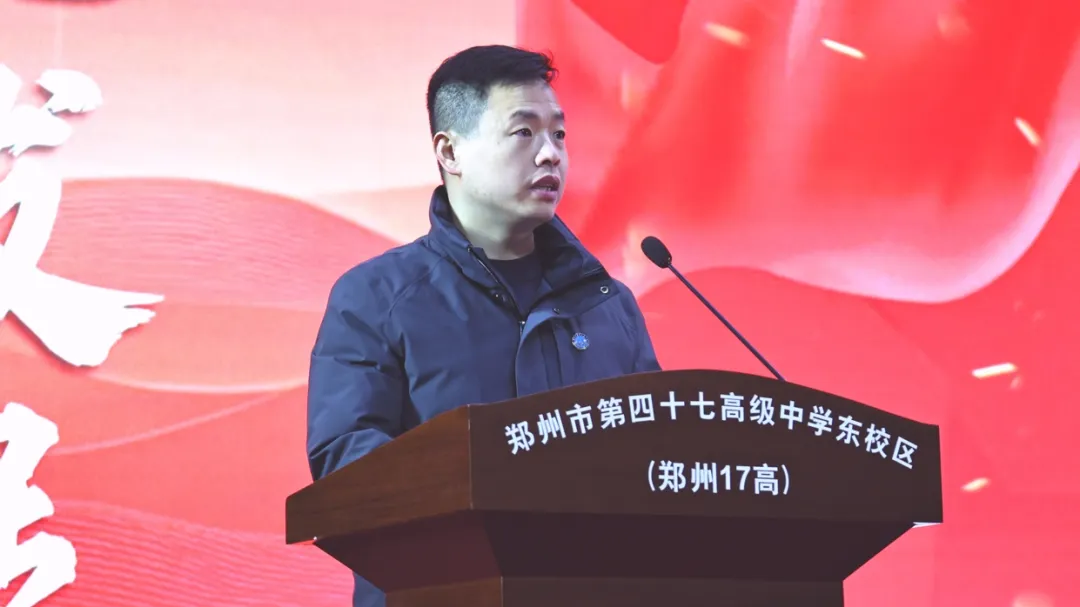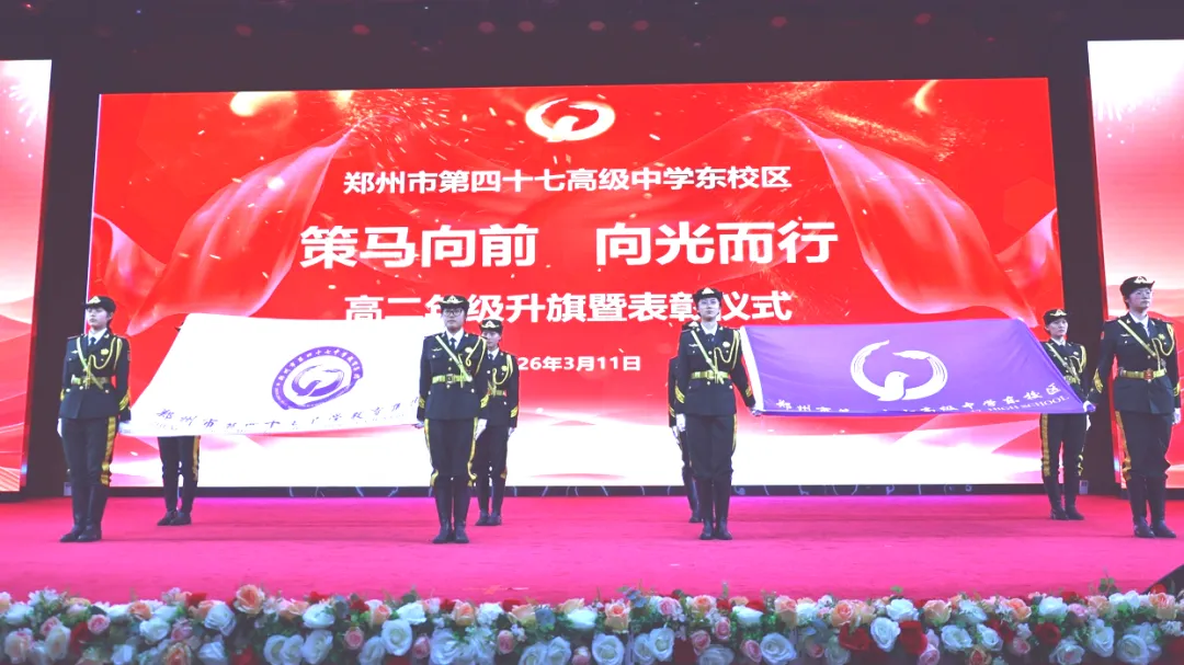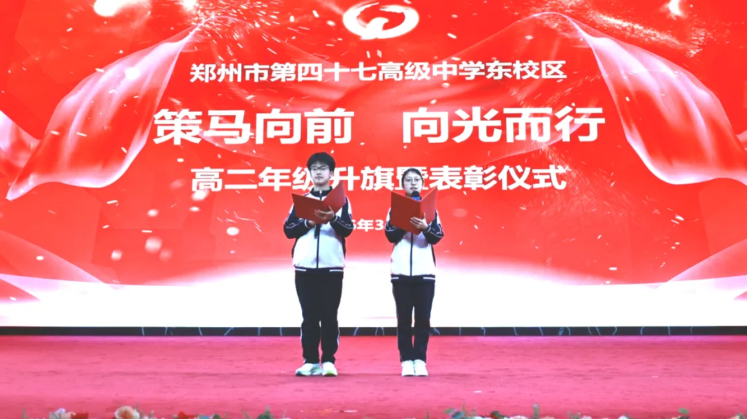 策马向前,向光而行 —— 郑州市第四十七高级中学东校区高二年级举行升旗暨表彰仪式春潮涌动启新程,榜样领航催奋进。为树立先进典范,凝聚成长力量,传承志愿精神,3月11日上午9点30分,郑州市第四十七高级中学东校区高二年级在闻道堂隆重举行 “策马向前,向光而行”升旗暨表彰仪式。郑州市第四十七高级中学东校区副校长栗红涛、副校长刘志勇、副校长孙明与高二全体师生齐聚一堂,在庄严的仪式中致敬榜样力量,在奋进的氛围中共赴青春新程。