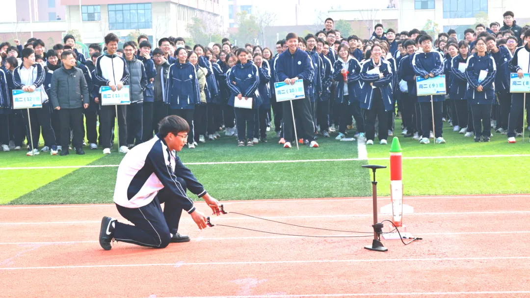 为助力学习科学高中的建设,升旗仪式结束后,高二年级在田径场上组织了寒假实践作业展示,年级物理备课组长叶帅杰带领学生代表在田径场上放飞寒假期间手工制作的“水火箭”。水火箭腾空而起的瞬间,同学们的欢呼声响彻操场。此次学科实践活动,既是将抽象物理知识转化为实操探索的生动尝试,更是学校航空航天特色教育的具象落地,诠释了勇于探索、永不言弃的科学精神。