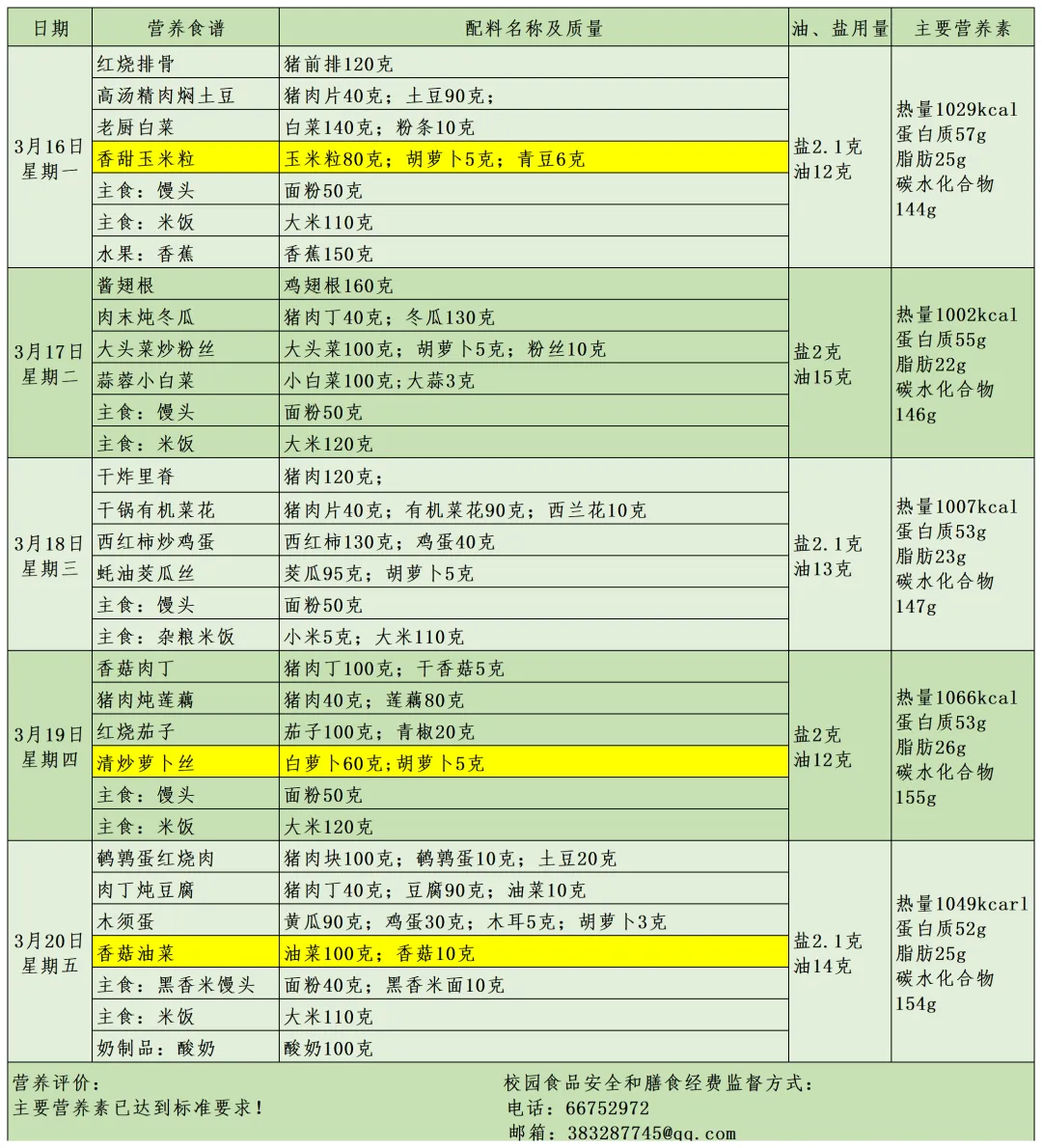 注: 以上菜品会根据原料组织情况或其它不可预见因素可能会做调整,敬请谅解!标注黄色部分为“三减”菜品。祝各位师生用餐愉快!