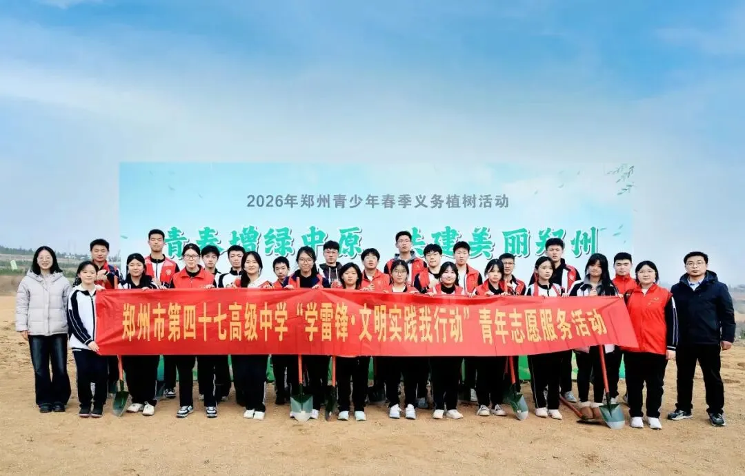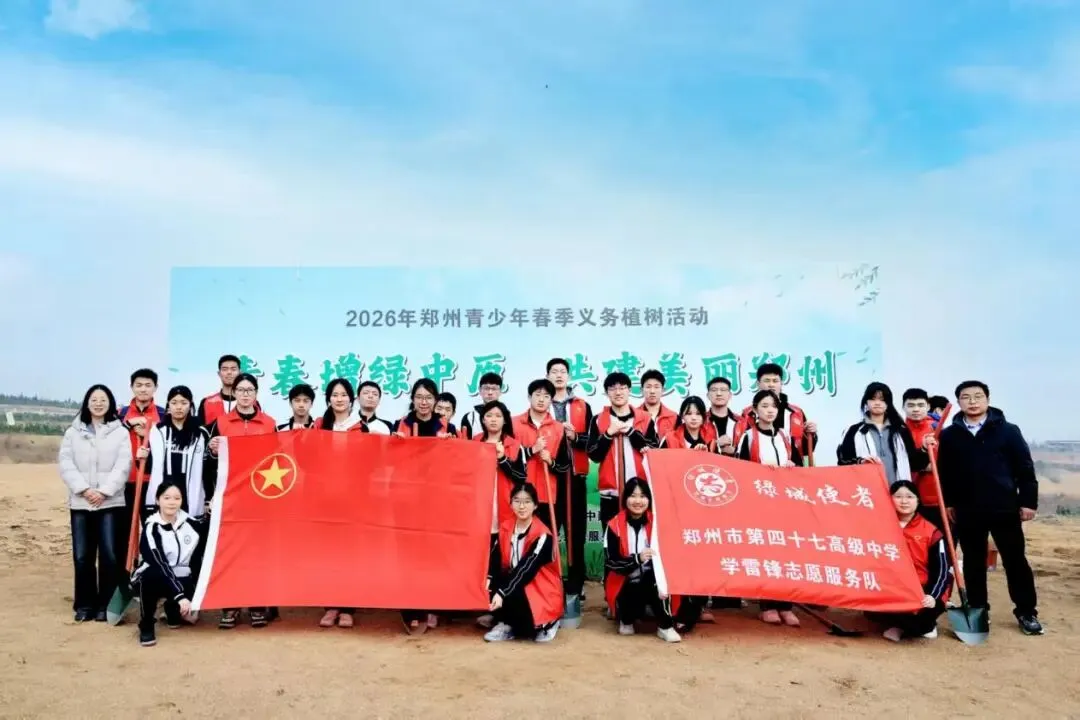 春风送暖,草木蔓发,在第48个植树节来临之际,为落实立德树人根本任务,深化生态文明教育与劳动教育融合,引导青年学子树立“绿水青山就是金山银山”的环保理念,3月11日,郑州市第四十七高级中学在郑州市全民义务植树基地组织开展2026年春季义务植树活动,四七学子以实际行动播撒绿色希望,为生态郑州建设添彩赋能。