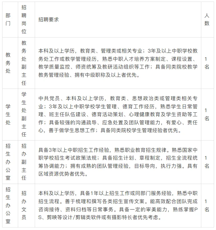 干教师、专业带头人、高技能人才,薪酬待遇可面议协商,助力人才扎根发展。