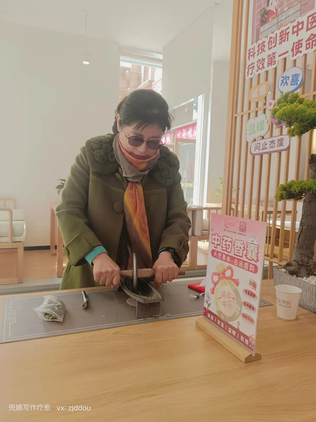 我们亲手体验了古法香囊制作:把天然草本药材放进药碾里,慢慢研磨成细碎的粉末,指尖能摸到草药的肌理,鼻尖萦绕着纯粹的草木香气。