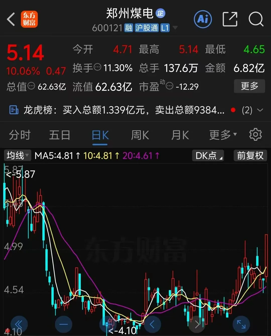 家人们,今天A股市场最热闹的场子,非郑州煤电(600121)莫属!3月12日,这只煤炭圈的“老炮儿”直接凭借10.06%的涨幅封死涨停,报收5.14元,换手率飙到11.30%,成交额狂揽6.82亿元,硬生生凭实力挤上龙虎榜C位,把资金博弈的戏码演得淋漓尽致。