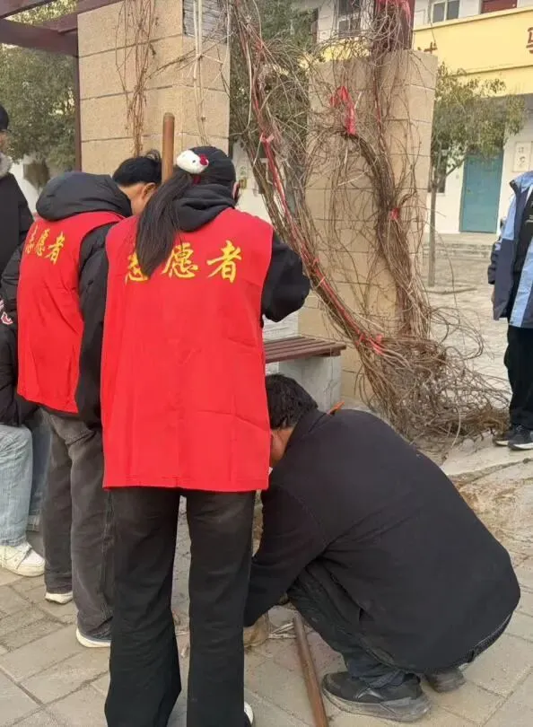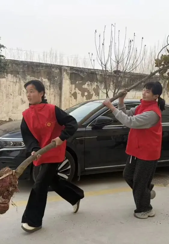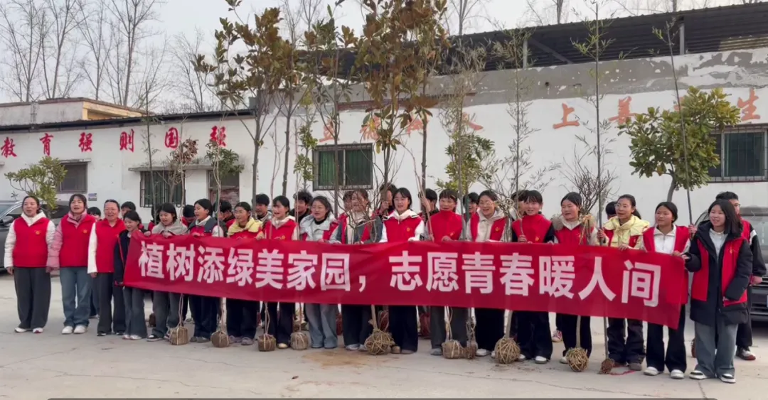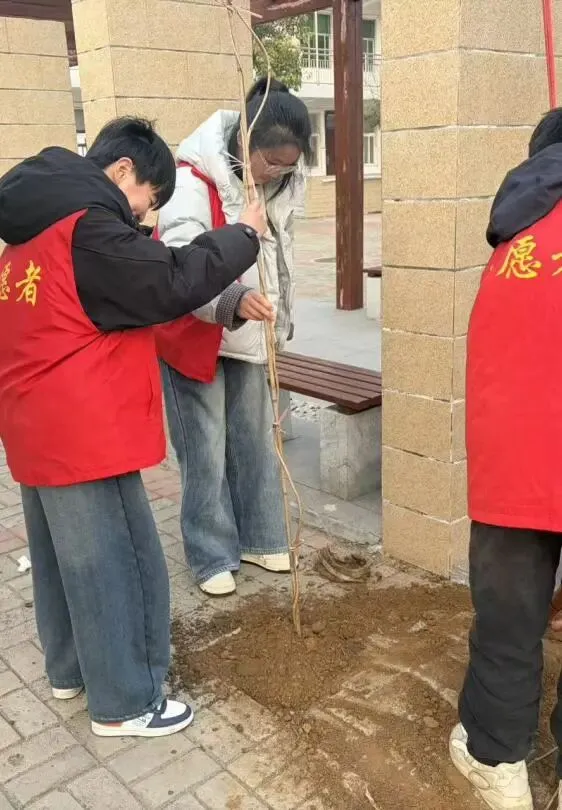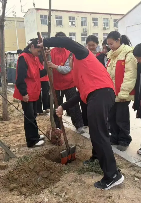 同学们身着志愿红马甲,化身“绿色使者”,合力将一棵棵树苗稳稳立起,用汗水浇灌新生的希望。