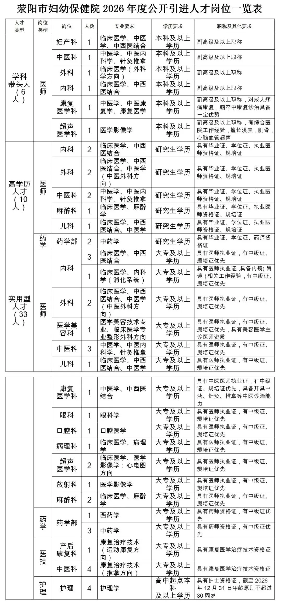 《荥阳市妇幼保健院2026年度公开引进人才岗位一览表》