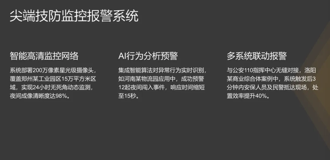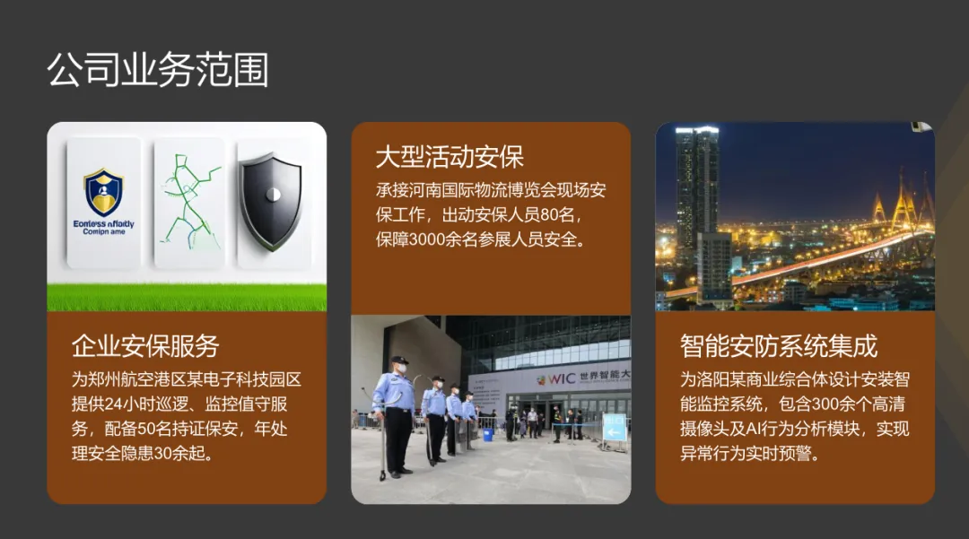 公司面向政府机关、金融系统、企事业单位、医疗卫生、高等院校、工业园区、建筑、厂矿、社区、高速公路收费站、服务区等单位,提供门卫、巡逻、执勤、监控、消防等安保服务。为大型演出、新闻发布会、体育赛事、演唱会、歌友会等各类文艺演出以及商业峰会、企业论坛、贸易洽谈会、公益活动等提供现场区域秩序维护、特保、特勤、VIP护卫。我公司技防部采用最先进的网络监控报警平台,专业从事110联网报警系统、监控摄像系统、可视对讲系统等安防工程,走在行业的前列,并可提供安防工程设计、施工和安装,比如为智能化小区、停车场管理、楼宇对讲以及智能家居提供解决方案,并提供远程监控、红外视频联网报警服务。可视报警信息与视频同步上传至系统平台。为中国智慧城市建设保驾护航!