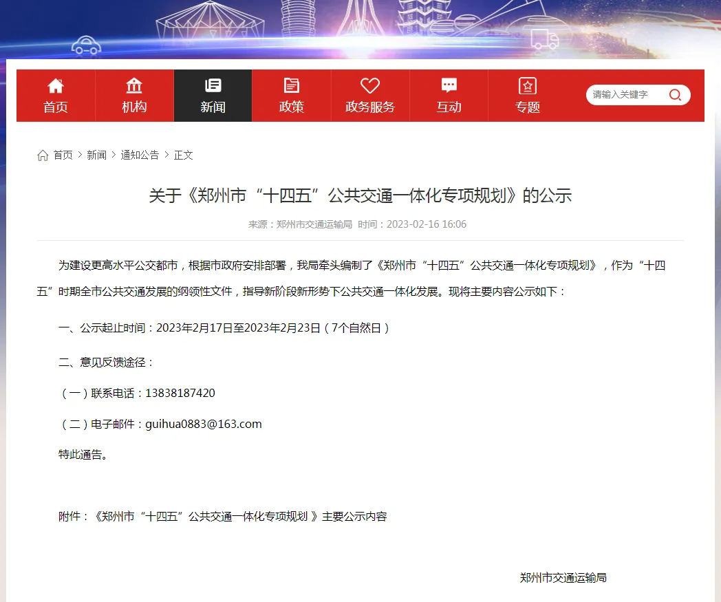 近日,郑州市交通运输局公示《郑州市“十四五”公共交通一体化专项规划》。