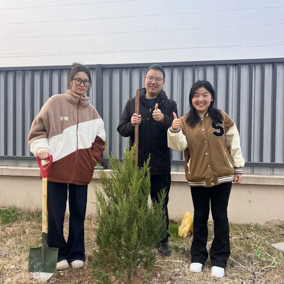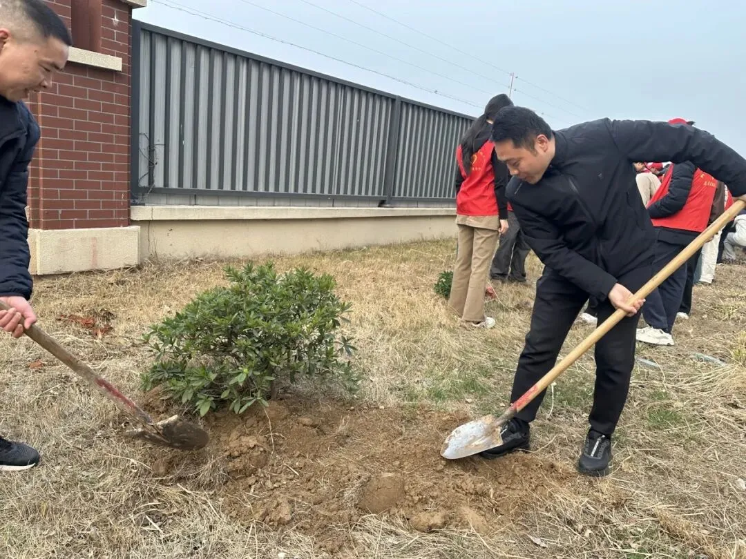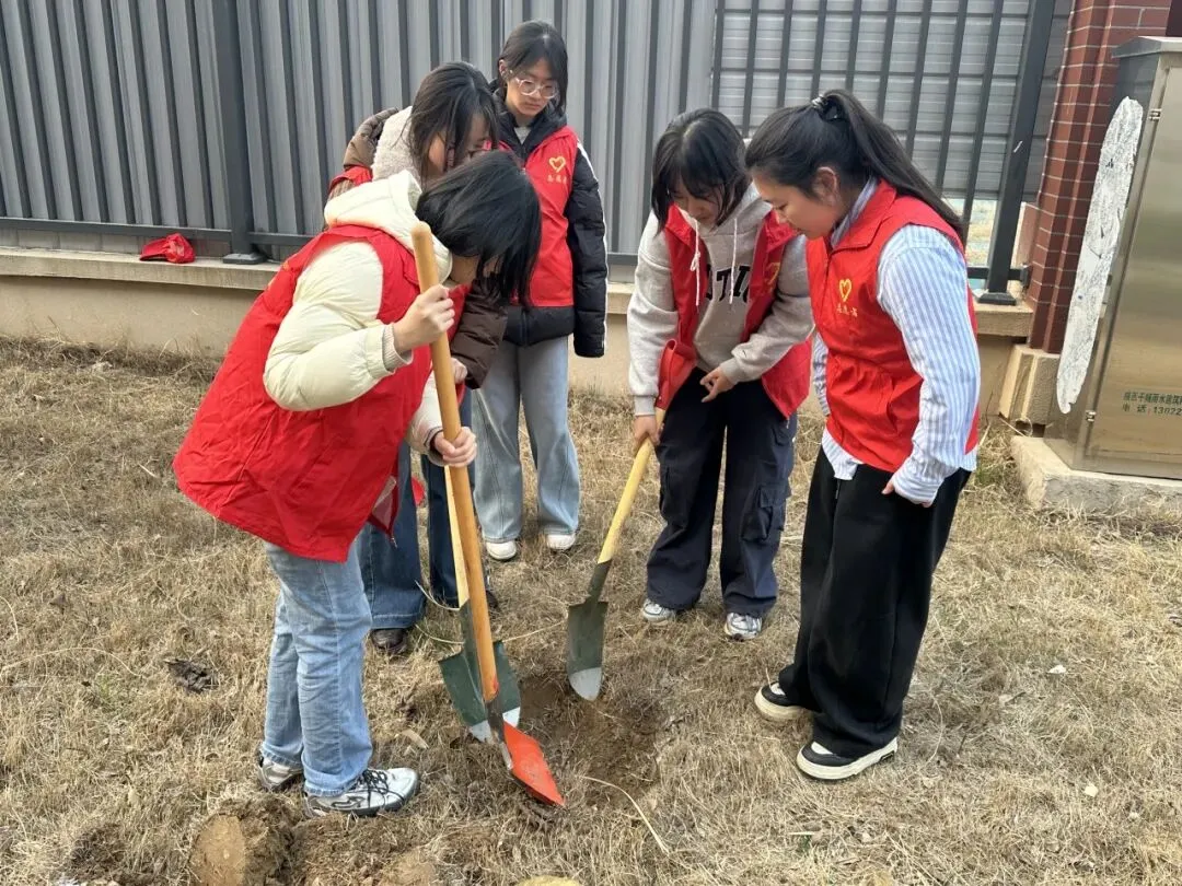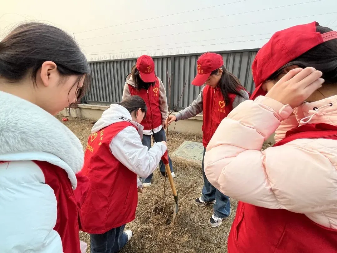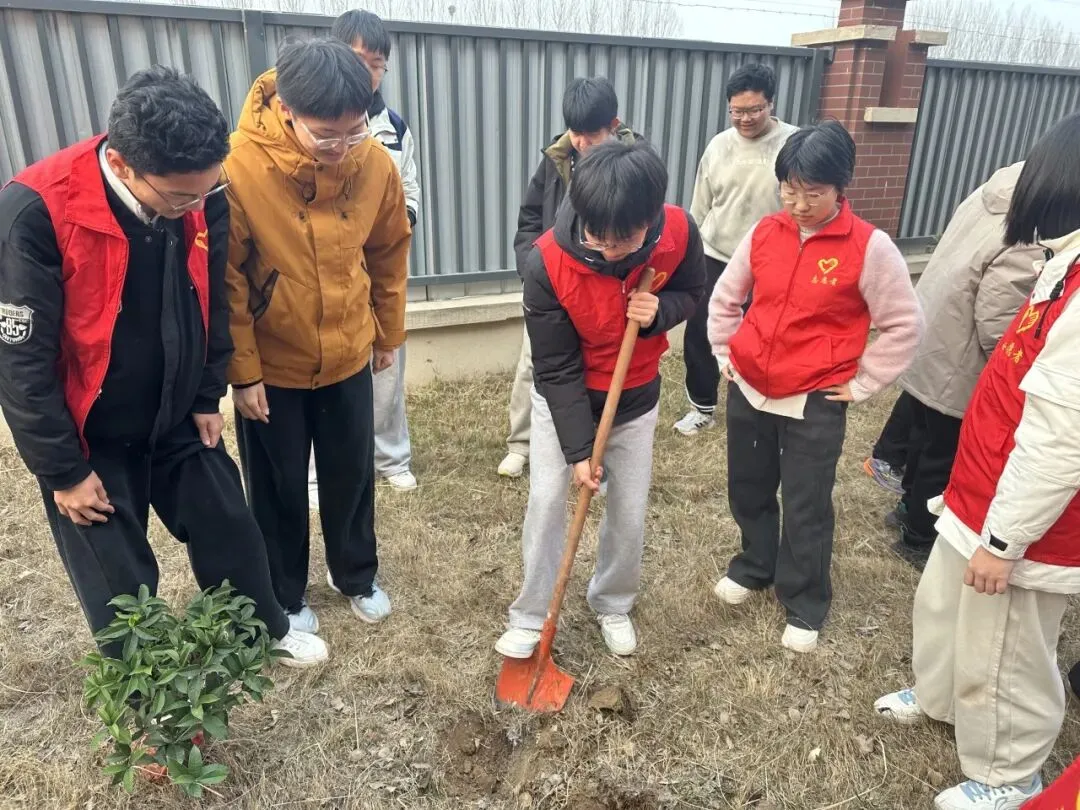 大家分组协作,干劲十足。有的挥锹挖土,额头渗出细汗;有的扶正树苗,眼神专注认真;有的提桶浇水,一株株新栽的树苗迎风挺立,嫩绿的枝叶在阳光下熠熠生辉,仿佛在诉说着春天的故事。活动现场,处处可见同学们互相帮助的温暖画面——你帮我扶正树苗,我帮你提桶浇水;力气大的同学主动接过铁锹多挖几下,细心的同学则为刚种下的树苗轻轻培土。“对待同志要像春天般的温暖”,雷锋同志这句名言,在同学们彼此协作、互帮互助的身影中得到了生动诠释。
