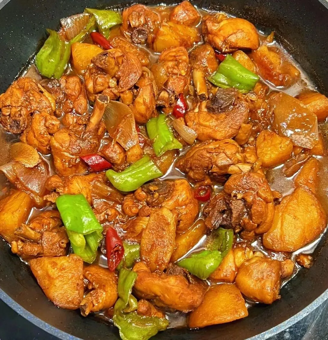 黄焖鸡:鸡腿块111g土豆111g 香菇5g 青椒2g