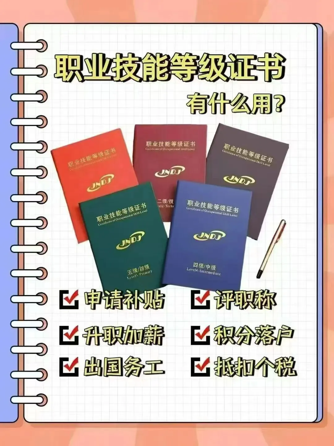 ☑ 持证可领补贴、积分落户、抵扣个税、轻松就业;