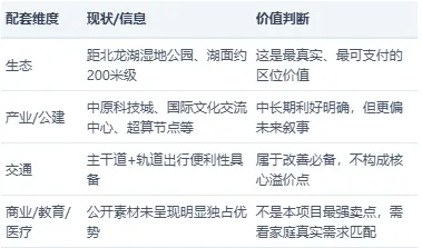 对璞逸缦湖来说,区位价值的核心不是全配套成熟,而是一线湖居资源+北岸未来发展权重。这对投资型判断和高净值资产配置是有吸引力的,但对强调日常便利、教育确定性、老人医疗半径的家庭,则未必构成绝对优势。