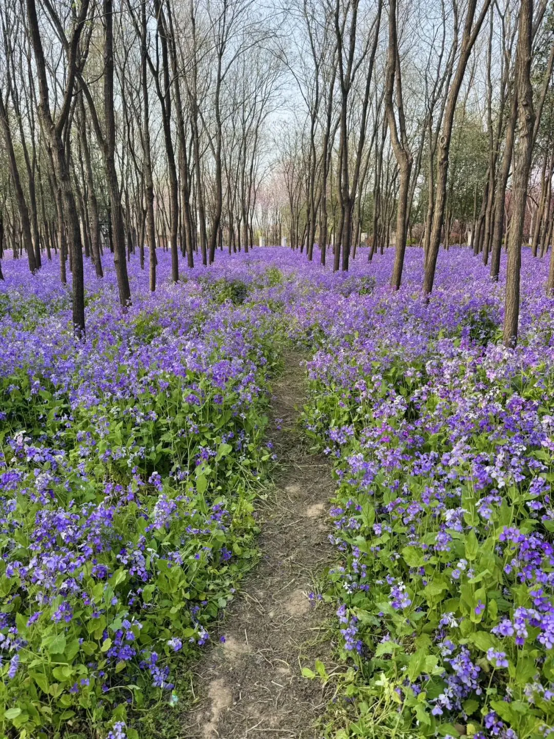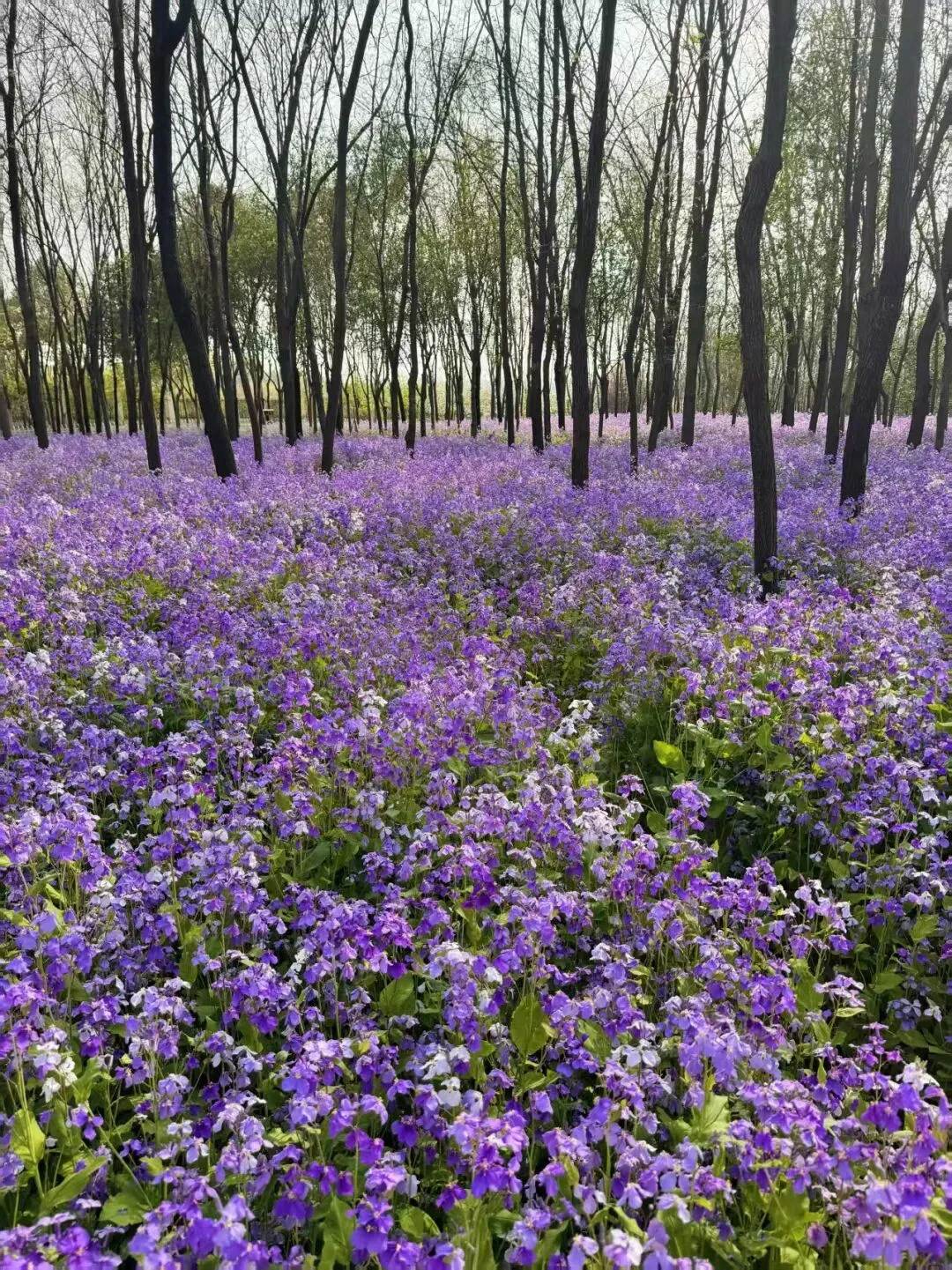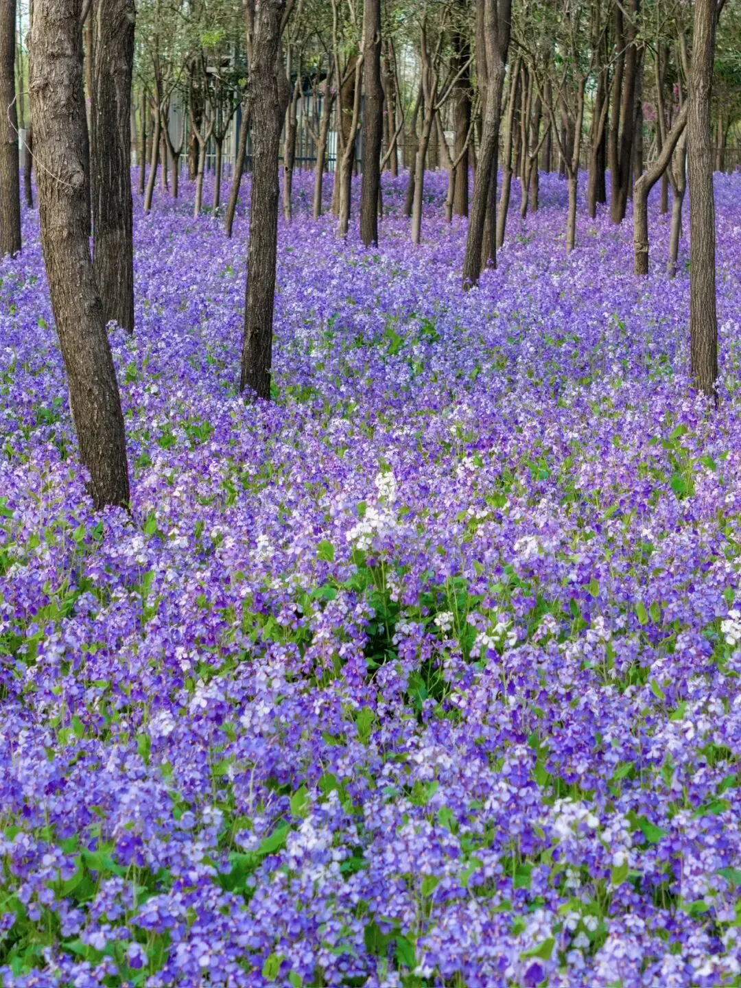 走进郑州树木园,最先闯入视线的便是那片颠覆你对春日色彩想象的二月兰花海。不同于桃花的粉嫩、樱花的轻盈,二月兰以一种坚韧而热烈的姿态,将整片土地晕染成深浅不一的紫色,仿佛是天空不小心打翻了紫色颜料桶,泼洒在4700亩的园区里,美得肆意、美得纯粹。