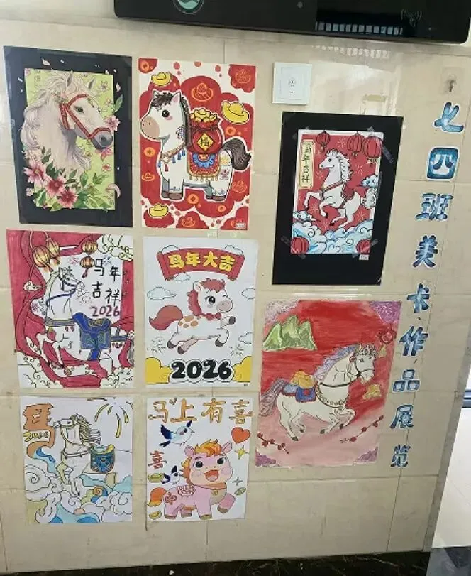 本次作品展以马年文化、新春民俗、生活美育为核心,面向七年级征集绘画、剪纸等各类作品,经美术组教师精心评选,遴选出优秀作品集中展出。作品紧扣丙午马年主题,既有骏马奔腾、福马迎春的灵动造型,又充分展现了孩子们观察生活、大胆想象、勇于创造的艺术素养。