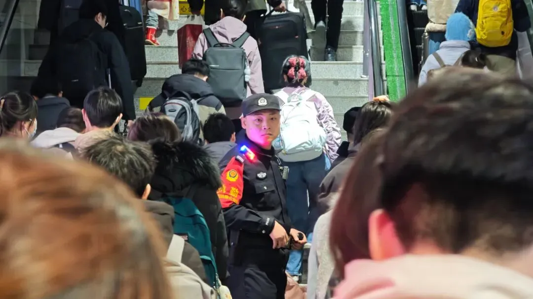 故事:进站口客流密集,南阳站派出所民警穿梭在人潮中维护秩序,引导旅客有序排队、安全进站。