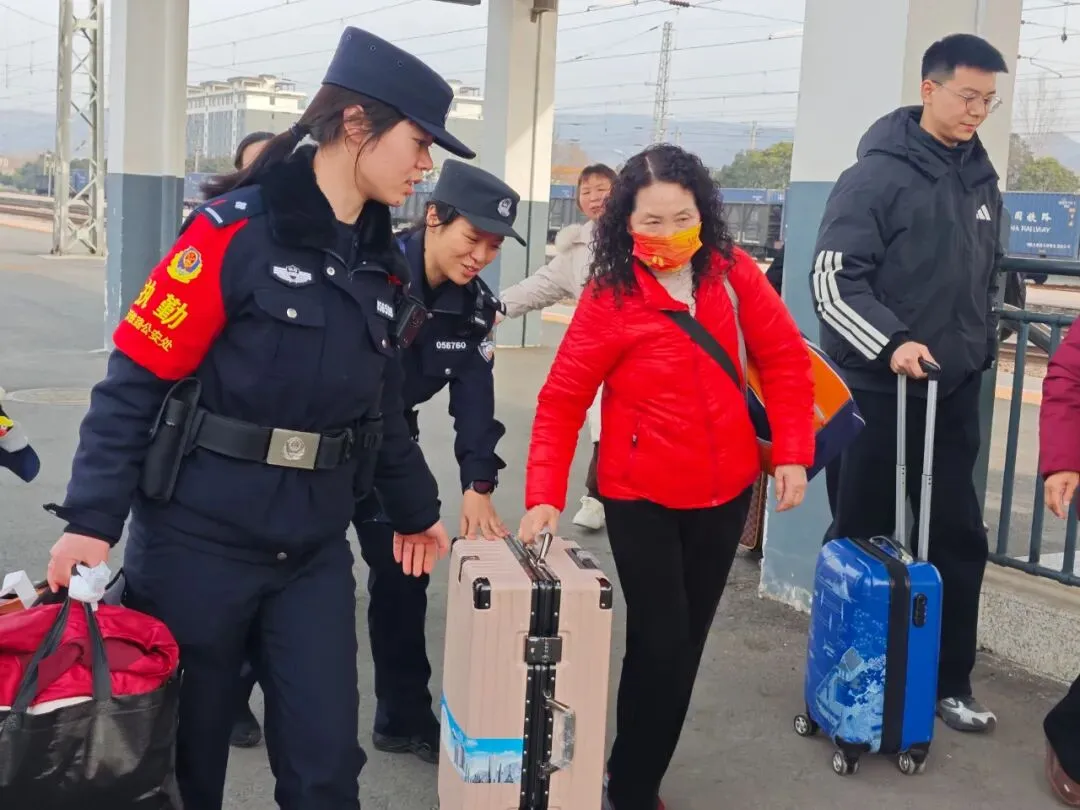 故事:春运期间,灵宝站派出所民警在站台主动帮扶携带大件行李的旅客,协助搬运行李、引导乘车,用暖心服务守护旅客平安归途。