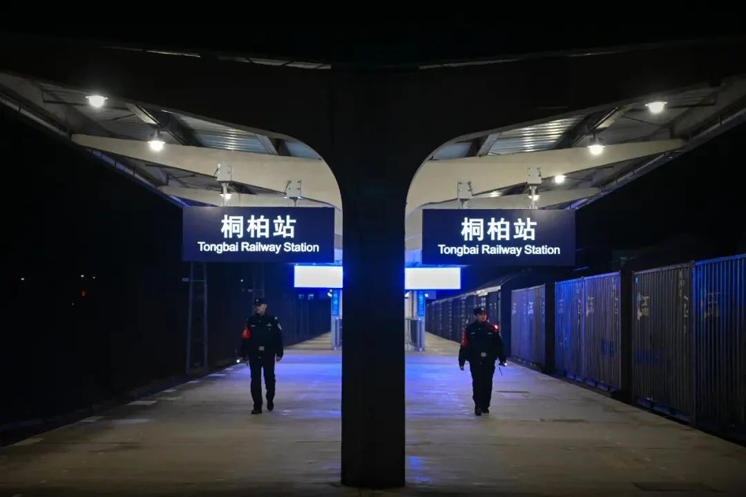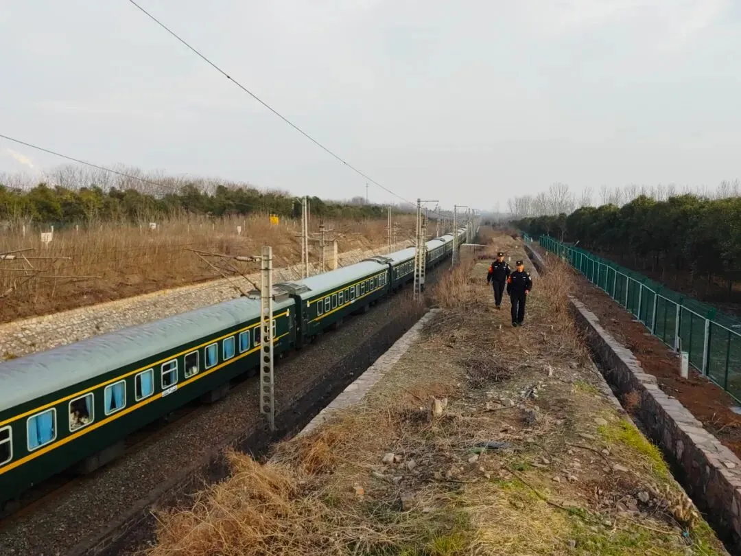 故事:春运路上,满载旅客的列车飞驰而过,执勤民警徒步巡查,用脚步夯实广大旅客群众返乡的平安归途。