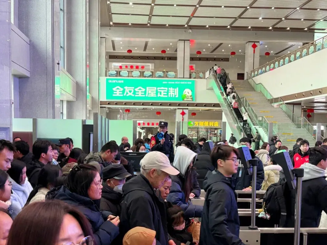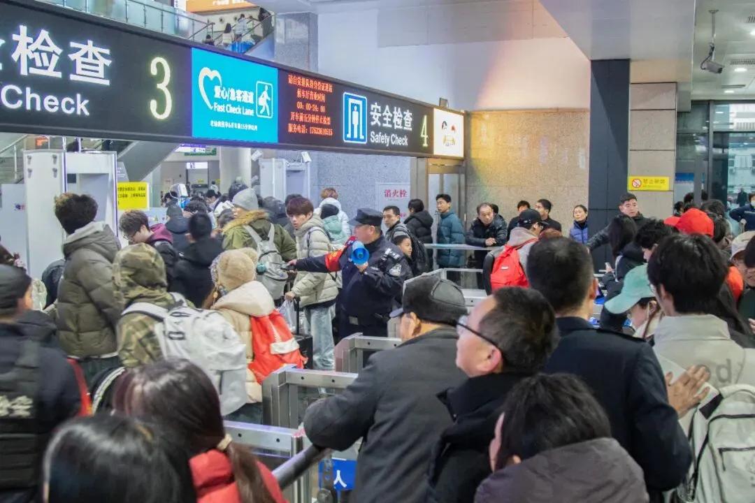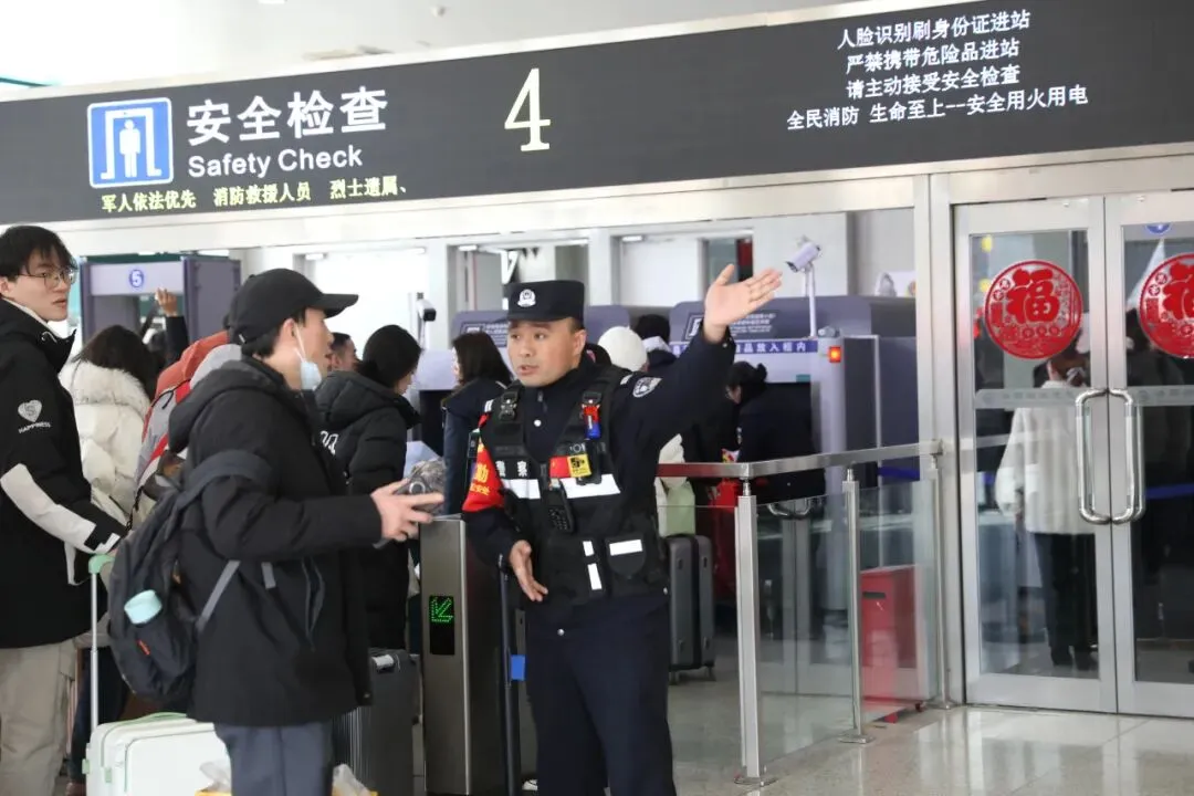 故事:福字贴满安检门,春运客流织成网。铁警伫立在安检口,抬手精准分流指引,让归乡的脚步更有序、更安心。