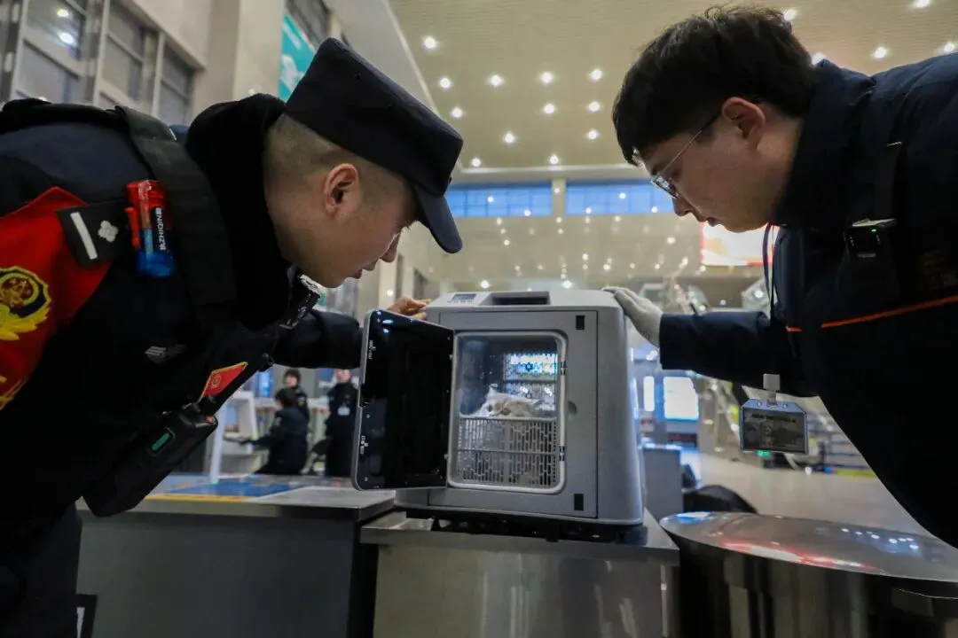 故事:洛阳龙门高铁站内,执勤民警对动物检疫合格证明进行认真核查,并打开托运箱查看宠物状态,提醒工作人员严格规范办理托运,确保旅途合规无忧,让旅客爱宠安全抵达目的地。