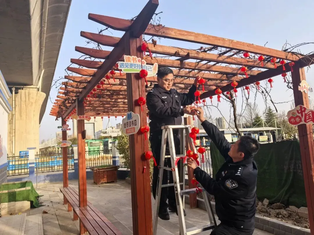 故事:绿博园站派出所的民警们分工协作,在所部廊架上悬挂红灯笼。一串串红火的灯笼高高挂起,将警营装点得年味十足,也为坚守岗位的民警们营造出温馨的节日氛围。