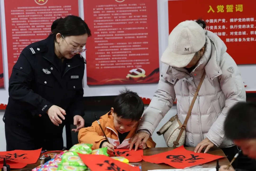 故事:红纸铺桌,小警娃握笔学写福字,民警妈妈俯身耐心指导,家属在旁暖心扶纸。稚嫩笔触写下马年福韵,墨香里藏着警营亲子的温情,年味十足。