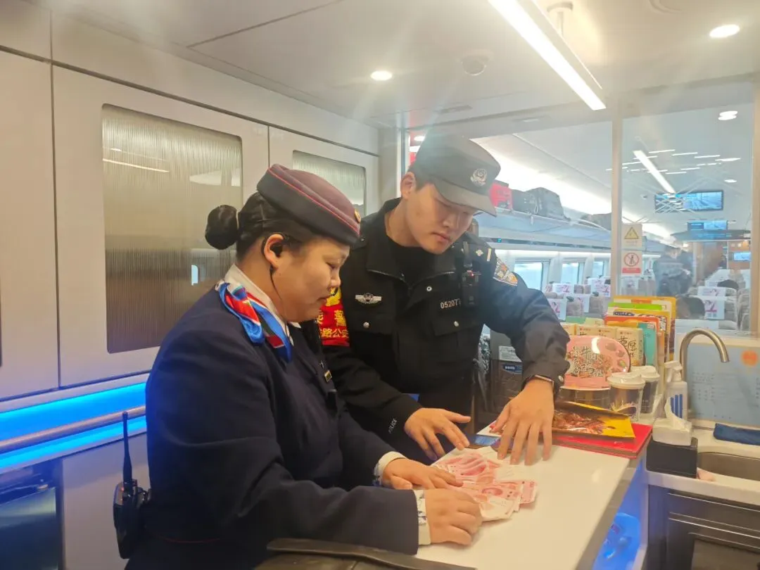 故事:G2401次乘警接到旅客报警求助,称其遗失了千元现金,乘警迅速开展工作,在座位附近仔细查找终于找回,经清点无误后归还旅客。