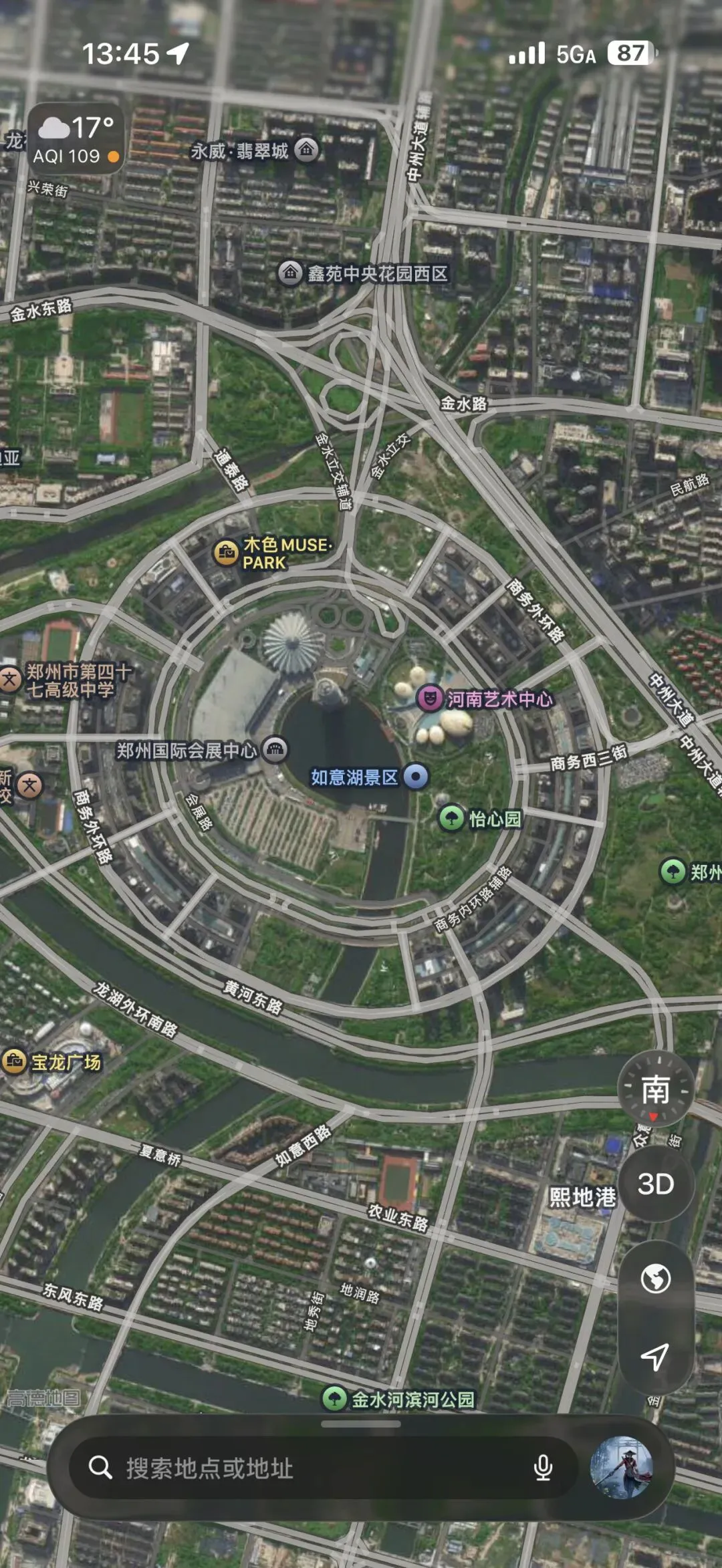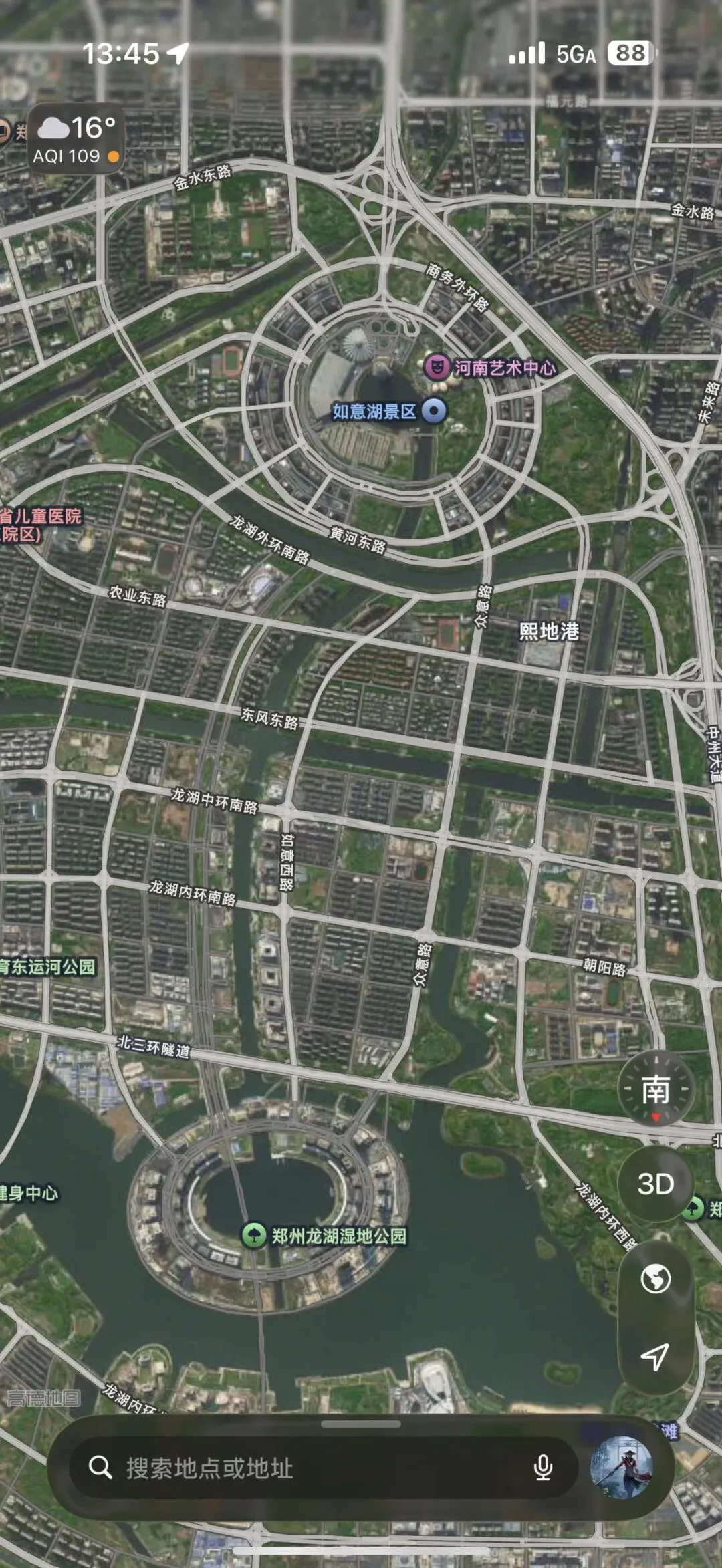 高空俯瞰,郑州国际会展中心如意湖+龙湖金融岛,浑然构成一柄巨型如意。