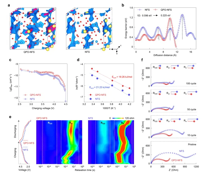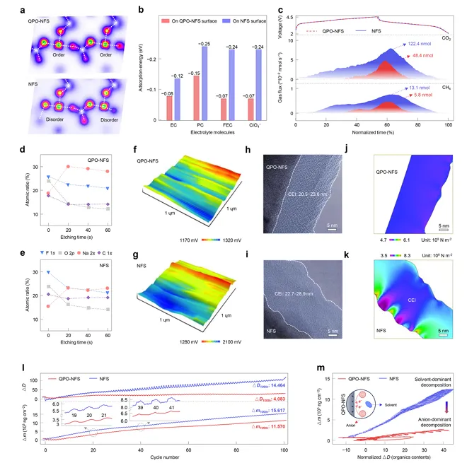 电动出行与智能电网对可再生储能的需求持续攀升,锂离子电池因锂资源稀缺性难以适配电网级应用,钠离子电池凭借资源丰富、安全性高、宽温工作的优势成为极具潜力的替代方案,高性能正极材料的开发是其发展关键。阿卢瓦德型Na₂₊₂ₓFe₂₋ₓ(SO₄)₃因资源丰度高、具有独特的三维聚阴离子骨架且Fe³⁺/Fe²⁺氧化还原电位达3.8 V(vs. Na⁺/Na)成为研究热点,但其Fe₂O₁₀二聚体中Fe–Fe间距短引发强库仑斥力,加之400 ℃以下热缺陷合成导致本征晶格畸变,在高温电化学循环中会出现多面体破裂、Fe溶出、框架不可逆坍塌等问题,同时传统高温退火易造成硫酸盐热分解,难以实现原子分布均匀调控与过渡金属-氧共价键增强,成为该类正极材料发展的核心瓶颈。近日,郑州大学化学学院陈卫华团队开发了50 Hz低频微波辅助的合成策略,利用极性键间的偶极相互作用在Na₂.₅Fe₁.₇₅(SO₄)₃晶体中构筑出准完美有序基元(QPO-NFS),该策略借助微波的由内而外加热和交变电场实现Fe²⁺、Na⁺、SO₄²⁻等离子的定向迁移,突破传统合成的随机成核限制,获得Fe–O键长和NaOₓ多面体体积更均匀的晶体结构,同时石墨烯氧化物的引入进一步强化离子定向组装效果;通过同步辐射XRD、球差校正高分辨透射电镜、X射线吸收光谱等表征证实,QPO-NFS的准完美有序结构大幅降低晶格缺陷与应力累积,增强了Fe 3d–O 2p共价杂化,优化了Na⁺传输通道并降低迁移能垒,还能抑制电解液异相反应、形成均匀稳定的阴极电解液界面(CEI),实现深度脱嵌钠过程中氧化还原反应与多面体演化的可逆进行,最终该正极材料展现出优异的循环稳定性与高温性能,并在软包电池中完成实用性验证。该成果以“Mitigating Lattice Distortion of Iron-Sulfate Cathode via Quasi-Perfect Ordered Motif for High-Temperature Sodium-Ion Batteries”为题发表在“Angewandte Chemie International Edition”期刊,第一作者是Zhang Jiyu、Ma Siyu、Wen Longfei。开发50 Hz低频微波辅助湿法合成策略,结合石墨烯氧化物的吸附热点效应,实现Fe²⁺、Na⁺、SO₄²⁻等离子的定向迁移与成核,突破传统硫酸盐合成的随机成核和400 ℃以上热分解限制,成功在Na₂.₅Fe₁.₇₅(SO₄)₃晶体中构筑准完美有序基元(QPO-NFS)。该结构大幅窄化键长分布,Fe–O键长分布范围从常规的1.97-2.37 Å优化为2.12-2.33 Å,Na–O键长标准差也显著降低,同时有效抑制晶格缺陷与应力累积,实现原子和键合的高度有序化。 准完美有序结构实现了电子结构与离子传输的双重优化,一方面增强Fe 3d–O 2p共价杂化,提升电子电导率,同时弱化Na–O键作用,使Na⁺迁移能垒从0.596 eV降至0.225 eV,Na⁺扩散系数提升一个数量级,达7.21×10⁻¹²至5.33×10⁻¹⁰ cm² s⁻¹;另一方面使晶体表面电荷分布均匀,抑制电解液组分的强吸附,减少52.9%–60.5%的气体释放,形成厚度20.5-23.6 nm、应力分布均匀的稳定阴极电解液界面,避免电解液持续分解与界面阻抗激增。 QPO-NFS正极展现出优异的电化学性能与高温稳定性,在25 ℃、2000 mA g⁻¹下实现超4000次循环,库仑效率超99.7%;60 ℃、2 C倍率下初始放电容量92.2 mAh g⁻¹,390次循环后容量保持率82.6%,高温循环寿命较常规样品提升53.8%。该正极在钠金属软包电池和钠离子软包电池中均实现稳定运行,钠离子软包电池比能量达133.7 Wh kg⁻¹,300次循环容量保持率71.2%,验证了其实际应用可行性,为电极材料的晶体结构设计与高温储能性能优化提供了新策略。图1展示了准完美有序的钠铁硫酸盐的微波辅助合成过程及结构表征结果,先通过示意图呈现微波场中离子定向成核形成准完美有序结构、常规条件下随机成核造成无序结构的差异,再通过XRD精修对比两种方式的前驱体和晶体物相,发现准完美有序晶体存在特有的超结构衍射峰,结合X射线吸收精细结构光谱和小波变换分析,证实其铁氧、铁铁键作用更强,配位更均匀,最终通过键长参数分析,明确准完美有序晶体的铁氧、钠氧键长分布更集中,原子排列有序性显著提升。 图2为准完美有序钠铁硫酸盐的晶体结构与电子结构分析结果,通过球差校正高分辨透射电镜观察到准完美有序晶体原子排列规则、晶面间距均一,无明显堆垛缺陷,而常规晶体存在晶格畸变与堆垛层错,几何相位分析量化显示前者应力集中区域极少,后者存在大量高应力区;原子有序化可视化和傅里叶变换图案进一步验证准完美有序晶体的结构规整性,结合态密度计算与电子能带结构示意图,表明准完美有序晶体的铁3d轨道峰展宽更小,钠氧键在费米能级附近以非键特性为主,铁3d与氧2p轨道杂化作用更强,电子传输动力学更优异。 图3呈现准完美有序钠铁硫酸盐正极的钠离子与电荷迁移动力学特征,先通过钠离子迁移通道可视化与一维能量曲线,显示其具有连通的离子传输通道且迁移能垒大幅降低,再结合恒电流间歇滴定技术测得其钠离子扩散系数较常规样品提升一个数量级,活化能计算与分布弛豫时间分析证明其电荷转移活化能更低、不同荷电状态下的阻抗特性更优,最终通过不同循环次数的交流阻抗谱,证实准完美有序晶体在循环过程中始终保持更低的电荷转移阻抗与沃伯格扩散阻抗,离子传输效率更稳定。 图4为淮完美有序钠铁硫酸盐正极的表面电子分布、阴极电解液界面特性及质量演化规律,通过电子分布图谱显示其表面氧原子分布规则、电子分布均匀,常规晶体则存在电子缺失区域;
