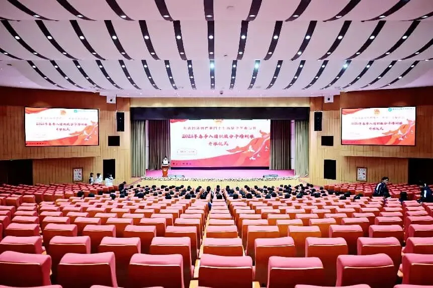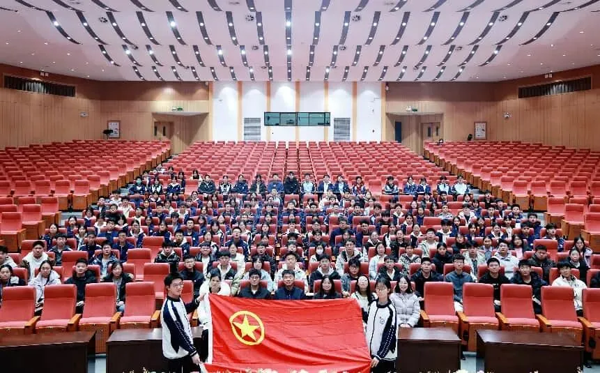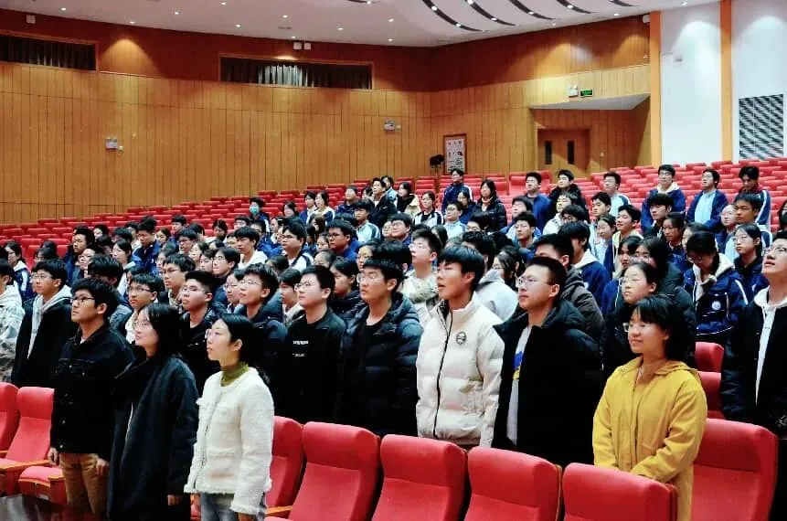 仪式在庄严的氛围中有序推进。全体人员起立,面向国旗,奏唱《中华人民共和国国歌》。激昂的旋律回荡在报告厅的每个角落,嘹亮的歌声凝聚着青年学子对祖国的赤诚热爱,彰显着新时代青年的蓬勃朝气,为整场活动奠定了庄重昂扬的基调。