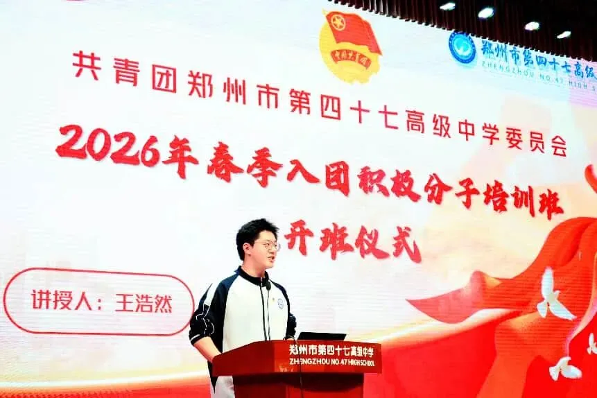 春潮涌动启新程,薪火相传续华章。为深入贯彻从严治团要求,严把团员发展入口关,强化青年学生思想政治引领,培养有理想、敢担当、能吃苦、肯奋斗的新时代好青年,近日,郑州市第四十七高级中学2026年春季入团积极分子培训班开班仪式暨团课第一课在学校报告厅举行。