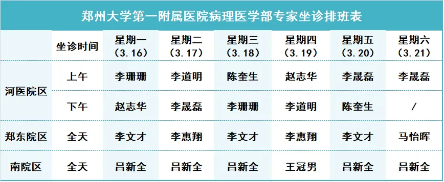 郑州大学第一附属医院病理医学部3.16--3.21三院区专家坐诊信息
