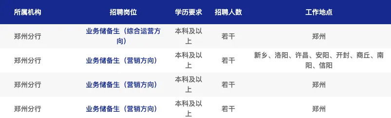 总行管理培训生:理工科专业背景及多学科复合型教育背景学生优先,培养成为精通银行业务的储备人才。