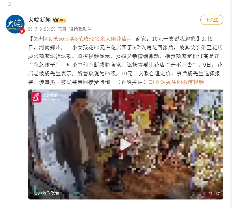 【郑州#父亲大闹花店,只因女儿花50元买5朵玫瑰#商家:10元一支说我忽悠】