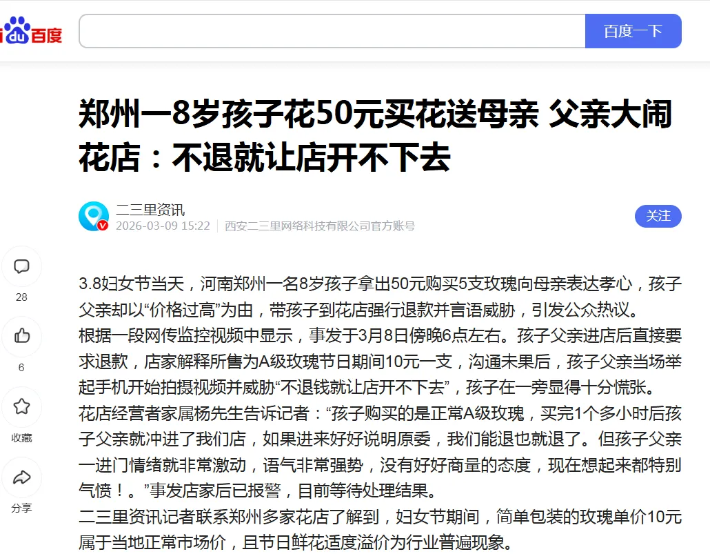 【郑州#女孩半月偷偷攒钱,50元只买到5朵玫瑰;父亲一怒大闹花店,30分钟却换得警方问询】