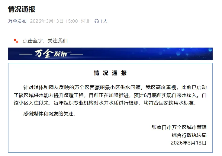 “在农村都开通自来水的情况下,我们小区的上万居民却吃了近十年的井水。”近日,河北张家口市西豪丽景小区住户李先生反映,盼望能够尽快喝上安全的自来水。“难怪水垢和虫卵多,家里的热水器都换了两个了,加装了过滤器”。去年11月,他和邻居聊天时得知,小区居民吃的是井水。3月13日,河北张家口市万全区城市管理综合行政执法局发布情况通报。(万全发布、海报新闻)